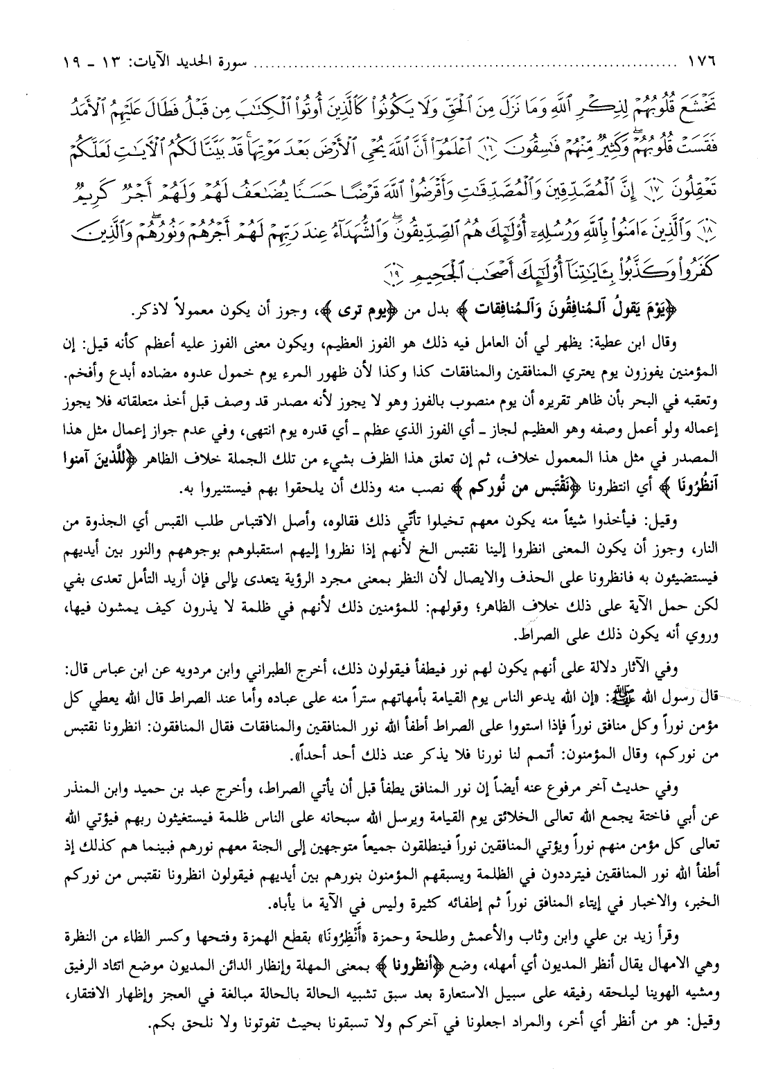 وقيل: فيأخذوا شيئا منه يكون معهم تخيلوا تأتّي ذلك فقالوه، وأصل الاقتباس طلب القبس أي الجذوة من النار، وجوز أن يكون المعنى انظروا إلينا نقتبس إلخ لأنهم إذا نظروا إليهم استقبلوهم بوجوههم والنور بين أيديهم فيستضيئون به فانظرونا على الحذف والإيصال لأن النظر بمعنى مجرد الرؤية يتعدى بإلى فإن أريد التأمل تعدى بفي لكن حمل الآية على ذلك خلاف الظاهر وقولهم: للمؤمنين ذلك لأنهم في ظلمة لا يذرون كيف يمشون فيها، وروي أنه يكون ذلك على الصراط.