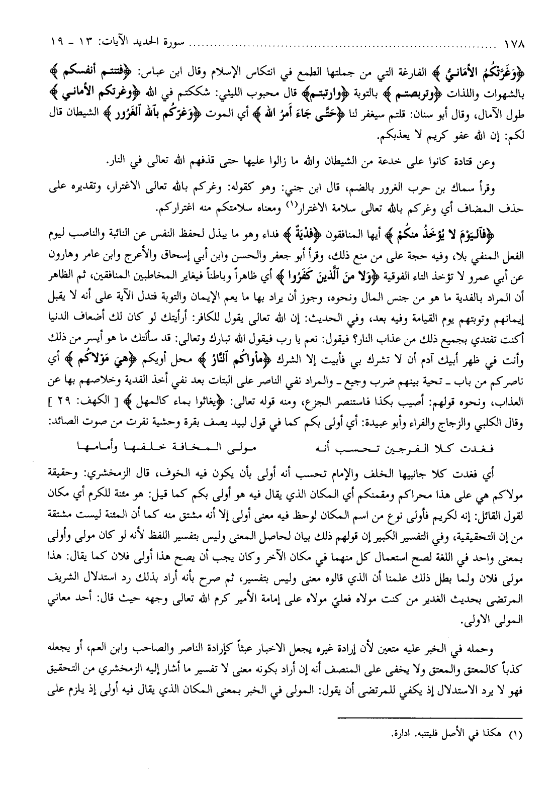 أي فغدت كلا جانبيها الخلف والإمام تحسب أنه أولى بأن يكون فيه الخوف، قال الزمخشري: وحقيقة مولاكم هي على هذا محراكم ومقمنكم أي المكان الذي يقال فيه هو أولى بكم كما قيل: هو مئنة للكرم أي مكان لقول القائل: إنه لكريم فأولى نوع من اسم المكان لوحظ فيه معنى أولى إلا أنه مشتق منه كما أن المئنة ليست مشتقة من إن التحقيقية، وفي التفسير الكبير إن قولهم ذلك بيان لحاصل المعنى وليس بتفسير اللفظ لأنه لو كان مولى وأولى بمعنى واحد في اللغة لصح استعمال كل منهما في مكان الآخر وكان يجب أن يصح هذا أولى فلان كما يقال: هذا مولى فلان ولما بطل ذلك علمنا أن الذي قالوه معنى وليس بتفسير، ثم صرح بأنه أراد بذلك رد استدلال الشريف المرتضى بحديث الغدير من كنت مولاه فعليّ مولاه على إمامة الأمير كرم الله تعالى وجهه حيث قال: أحد معاني المولى الاولى.