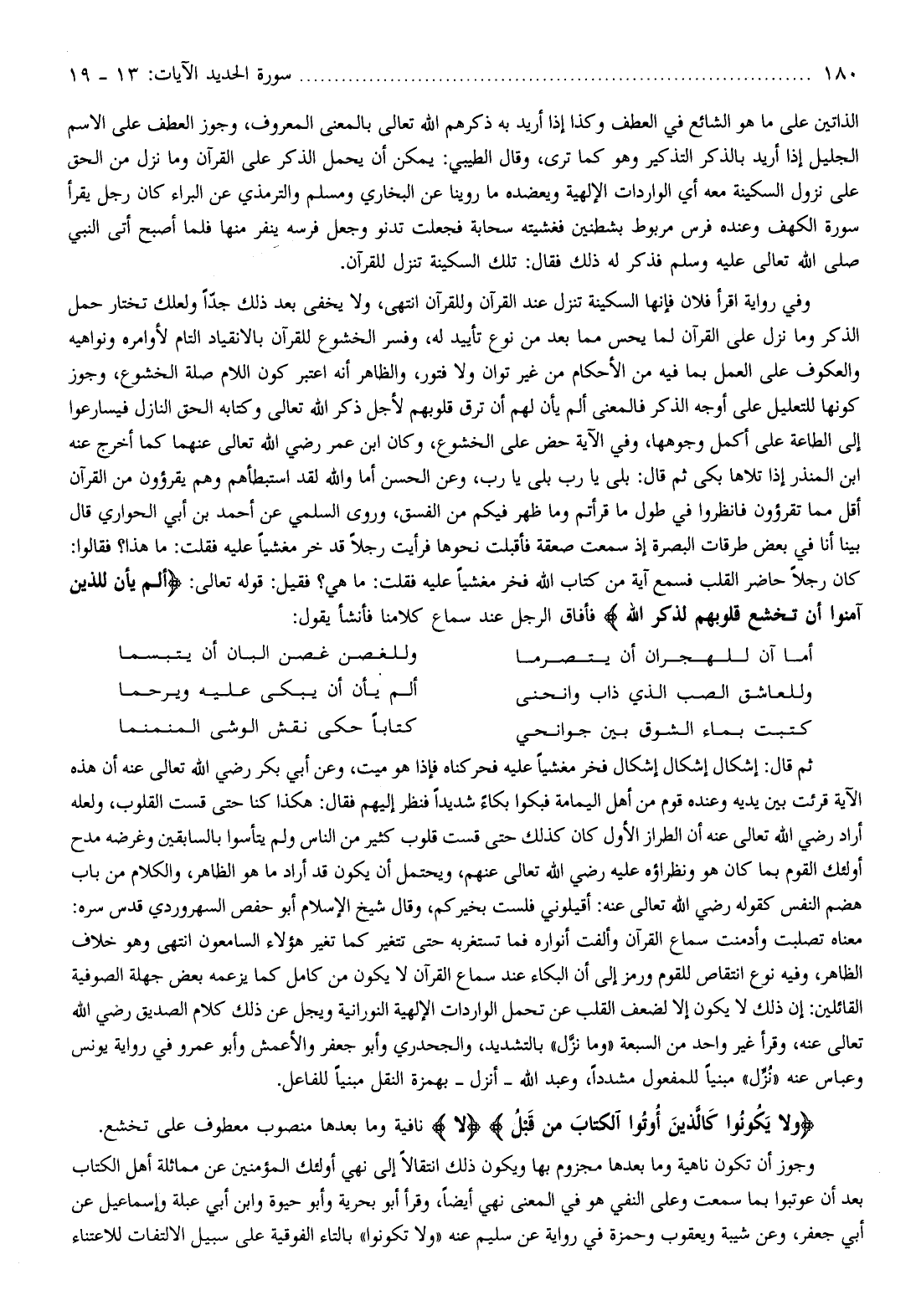 انتهى، ولا يخفى بعد ذلك جدّا ولعلك تختار حمل الذكر وما نزل على القرآن لما يحس مما بعد من نوع تأييد له، وفسر الخشوع للقرآن بالانقياد التام لأوامره ونواهيه والعكوف على العمل بما فيه من الأحكام من غير توان ولا فتور، والظاهر أنه اعتبر كون اللام صلة الخشوع، وجوز كونها للتعليل على أوجه الذكر فالمعنى ألم يأن لهم أن ترق قلوبهم لأجل ذكر الله تعالى وكتابه الحق النازل فيسارعوا إلى الطاعة على أكمل وجوهها، وفي الآية حض على الخشوع، وكان ابن عمر رضي الله تعالى عنهما كما أخرج عنه ابن المنذر إذا تلاها بكى ثم قال: بلى يا رب بلى يا رب، وعن الحسن أما والله لقد استبطأهم وهم يقرؤون من القرآن أقل مما تقرءون فانظروا في طول ما قرأتم وما ظهر فيكم من الفسق، وروى السلمي عن أحمد بن أبي الحواري قال بينا أنا في بعض طرقات البصرة إذ سمعت صعقة فأقبلت نحوها فرأيت رجلا قد خر مغشيا عليه فقلت: ما هذا؟ فقالوا: