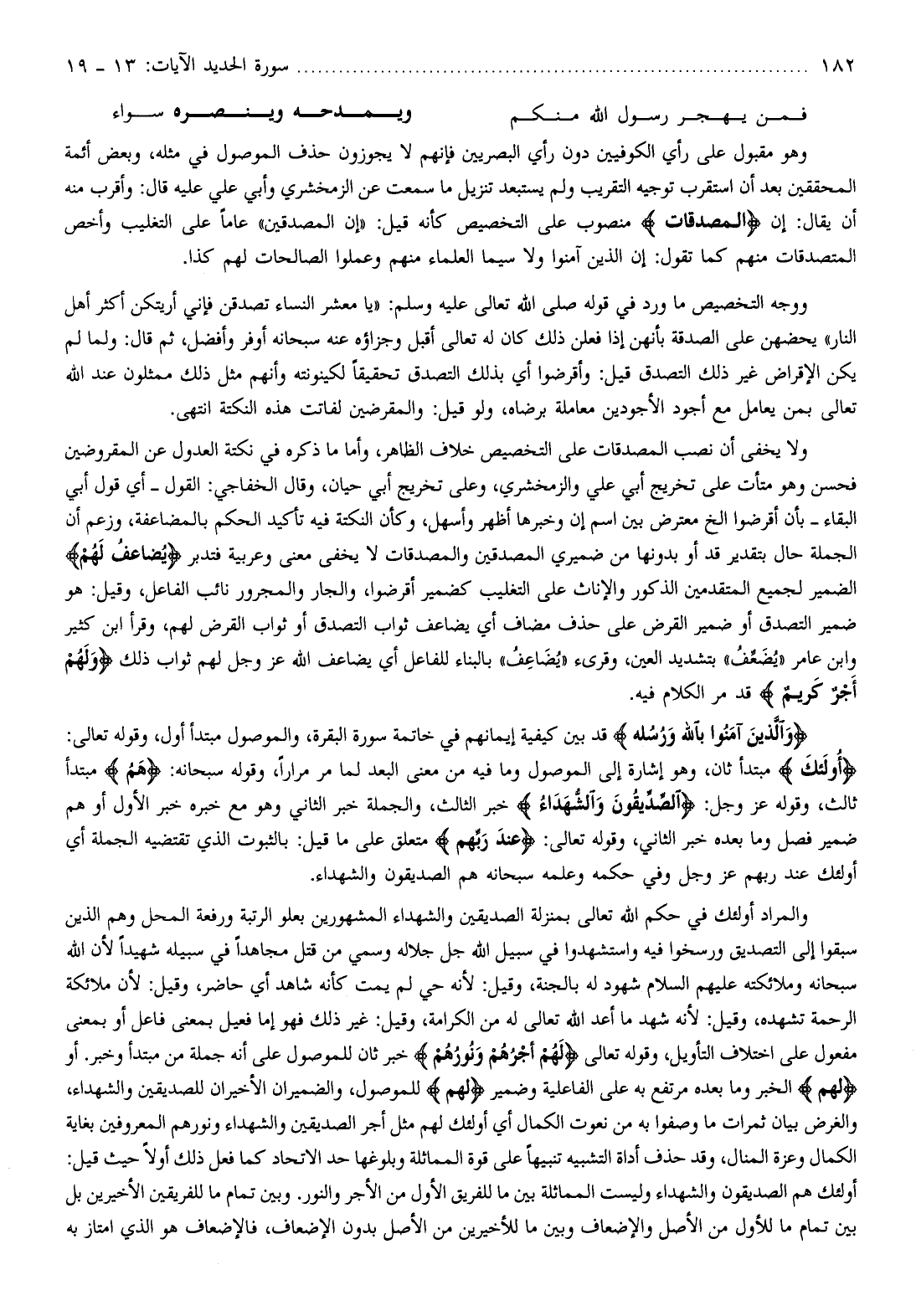 أولئك هم الصديقون والشهداء وليست المماثلة بين ما للفريق الأول من الأجر والنور. وبين تمام ما للفريقين الأخيرين بل بين تمام ما للأول من الأصل والإضعاف وبين ما للأخيرين من الأصل بدون الإضعاف، فالإضعاف هو الذي امتاز به