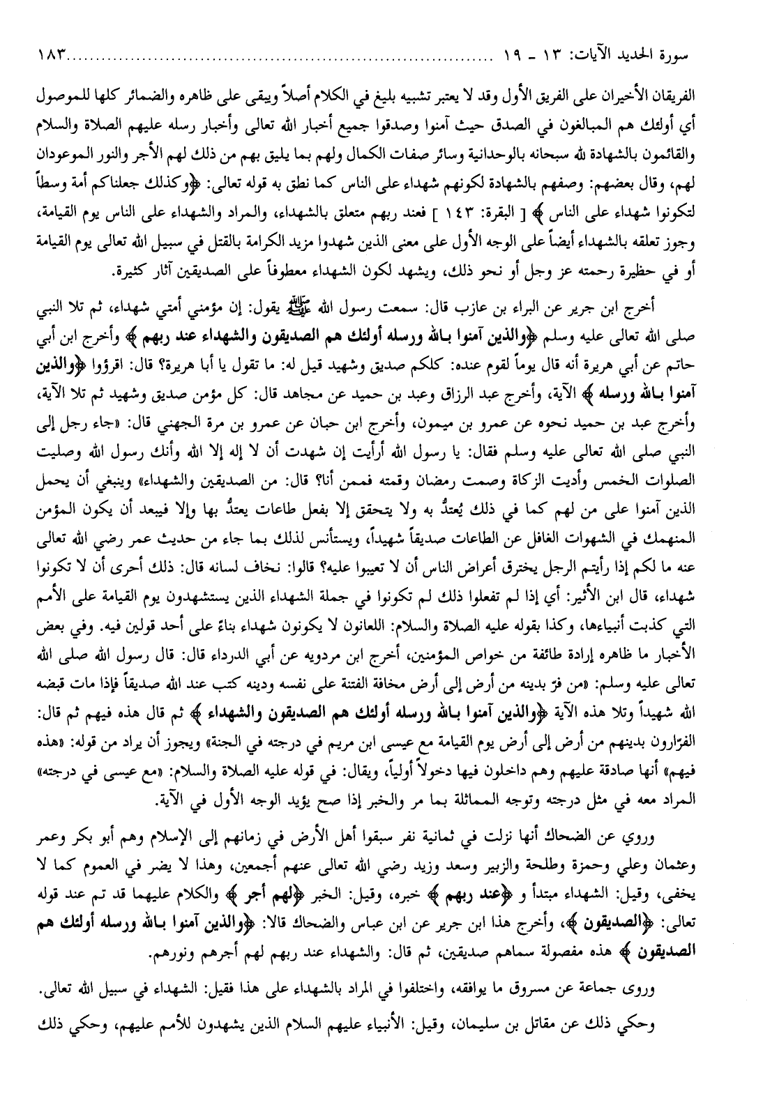 أخرج ابن جرير عن البراء بن عازب قال: سمعت رسول الله صلّى الله عليه وسلم يقول: إن مؤمني أمتي شهداء، ثم تلا النبي صلى الله تعالى عليه وسلم وَالَّذِينَ آمَنُوا بِاللَّهِ وَرُسُلِهِ أُولئِكَ هُمُ الصِّدِّيقُونَ وَالشُّهَداءُ عِنْدَ رَبِّهِمْ
