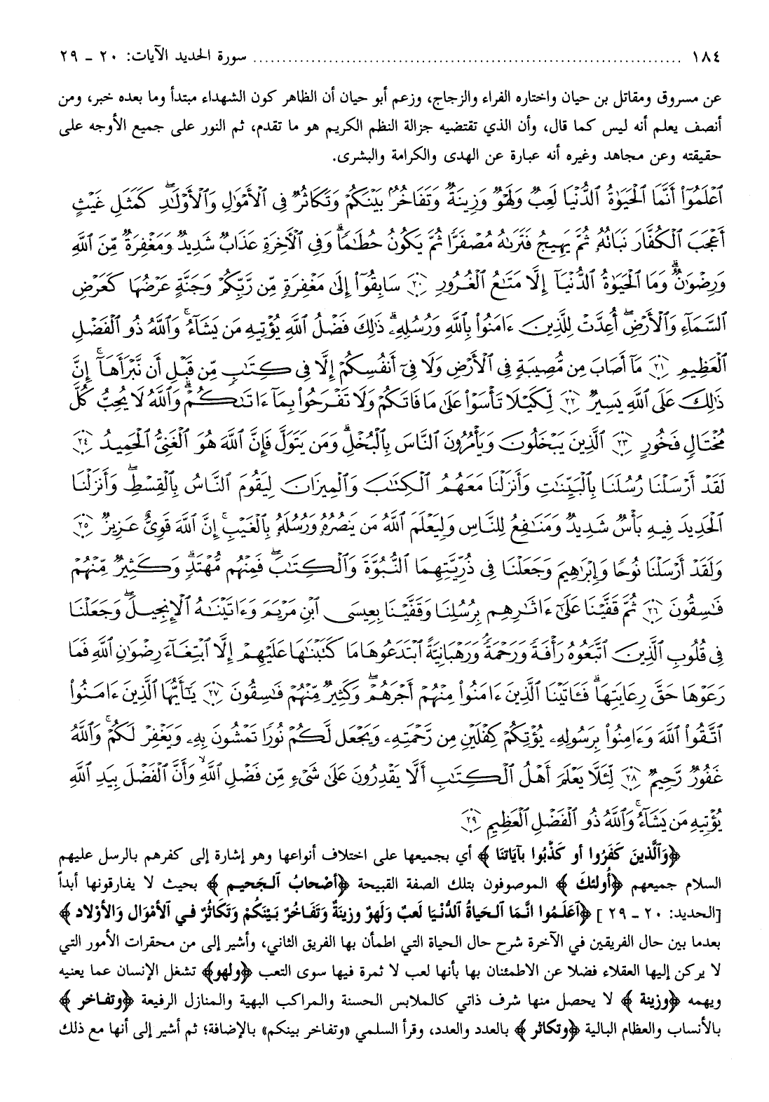 وَالَّذِينَ كَفَرُوا وَكَذَّبُوا بِآياتِنا أي بجميعها على اختلاف أنواعها وهو إشارة إلى كفرهم بالرسل عليهم السلام جميعهم أُولئِكَ الموصوفون بتلك الصفة القبيحة أَصْحابُ الْجَحِيمِ بحيث لا يفارقونها أبدا [الحديد: 20- 29] اعْلَمُوا أَنَّمَا الْحَياةُ الدُّنْيا لَعِبٌ وَلَهْوٌ وَزِينَةٌ وَتَفاخُرٌ بَيْنَكُمْ وَتَكاثُرٌ فِي الْأَمْوالِ وَالْأَوْلادِ بعد ما بين حال الفريقين في الآخرة شرح حال الحياة التي اطمأن بها الفريق الثاني، وأشير إلى من محقرات الأمور التي لا يركن إليها العقلاء فضلا عن الاطمئنان بها بأنها لعب لا ثمرة فيها سوى التعب وَلَهْوٌ تشغل الإنسان عما يعنيه ويهمه وَزِينَةٌ لا يحصل منها شرف ذاتي كالملابس الحسنة والمراكب البهية والمنازل الرفيعة وَتَفاخُرٌ بالأنساب والعظام البالية وَتَكاثُرٌ بالعدد والعدد، وقرأ السلمي «وتفاخر بينكم» بالإضافة ثم أشير إلى أنها مع ذلك