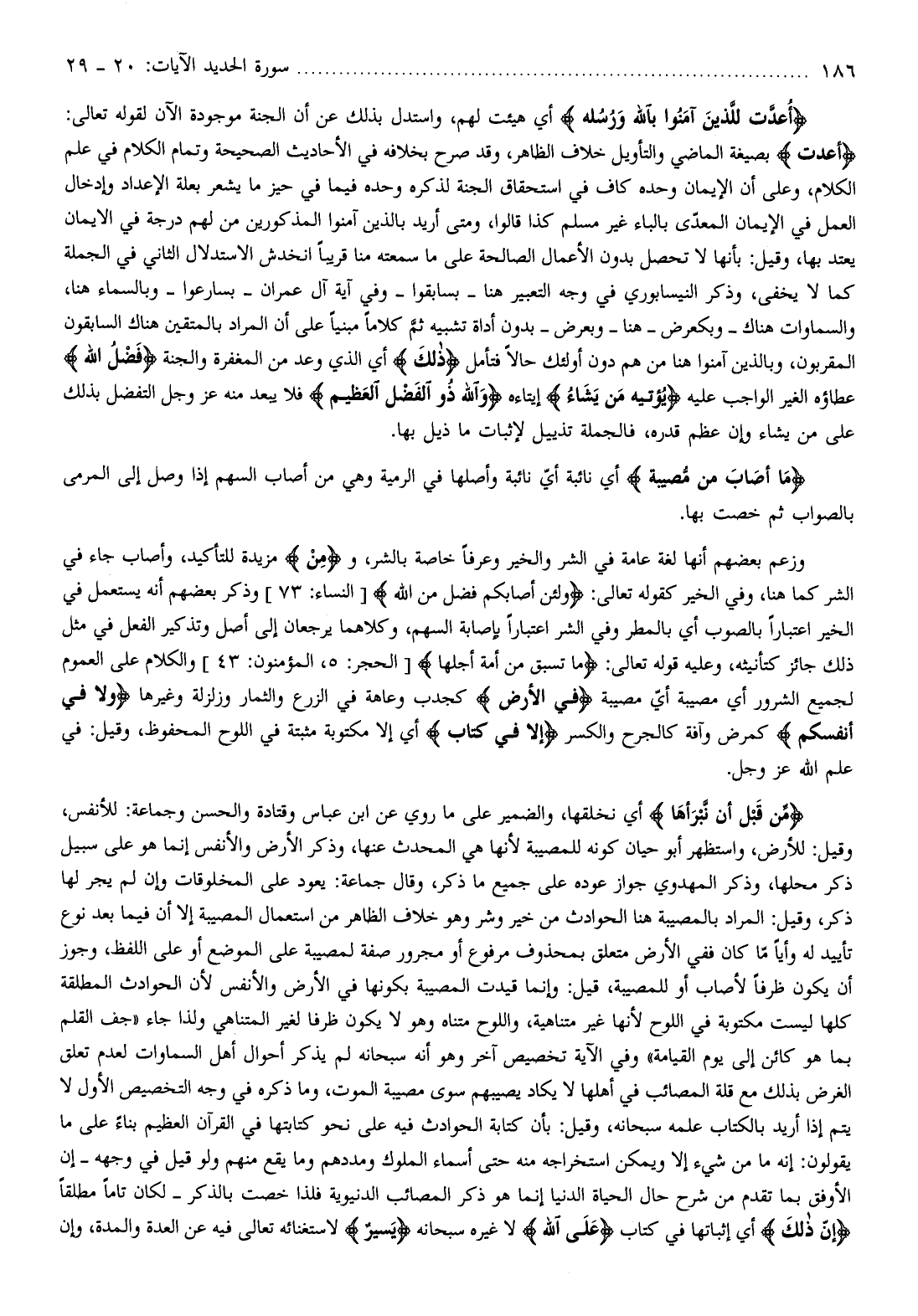 وزعم بعضهم أنها لغة عامة في الشر والخير وعرفا خاصة بالشر، ومِنْ مزيدة للتأكيد، وأصاب جاء في الشر كما هنا، وفي الخير كقوله تعالى: وَلَئِنْ أَصابَكُمْ فَضْلٌ مِنَ اللَّهِ [النساء: 73] وذكر بعضهم أنه يستعمل في الخير اعتبارا بالصوب أي بالمطر وفي الشر اعتبارا بإصابة السهم، وكلاهما يرجعان إلى أصل وتذكير الفعل في مثل ذلك جائز كتأنيثه، وعليه قوله تعالى: ما تَسْبِقُ مِنْ أُمَّةٍ أَجَلَها [الحجر: 5، المؤمنون: 43] والكلام على العموم لجميع الشرور أي مصيبة أيّ مصيبة فِي الْأَرْضِ كجدب وعاهة في الزرع والثمار وزلزلة وغيرها وَلا فِي أَنْفُسِكُمْ كمرض وآفة كالجرح والكسر إِلَّا فِي كِتابٍ أي إلا مكتوبة مثبتة في اللوح المحفوظ، وقيل: في علم الله عز وجل.
