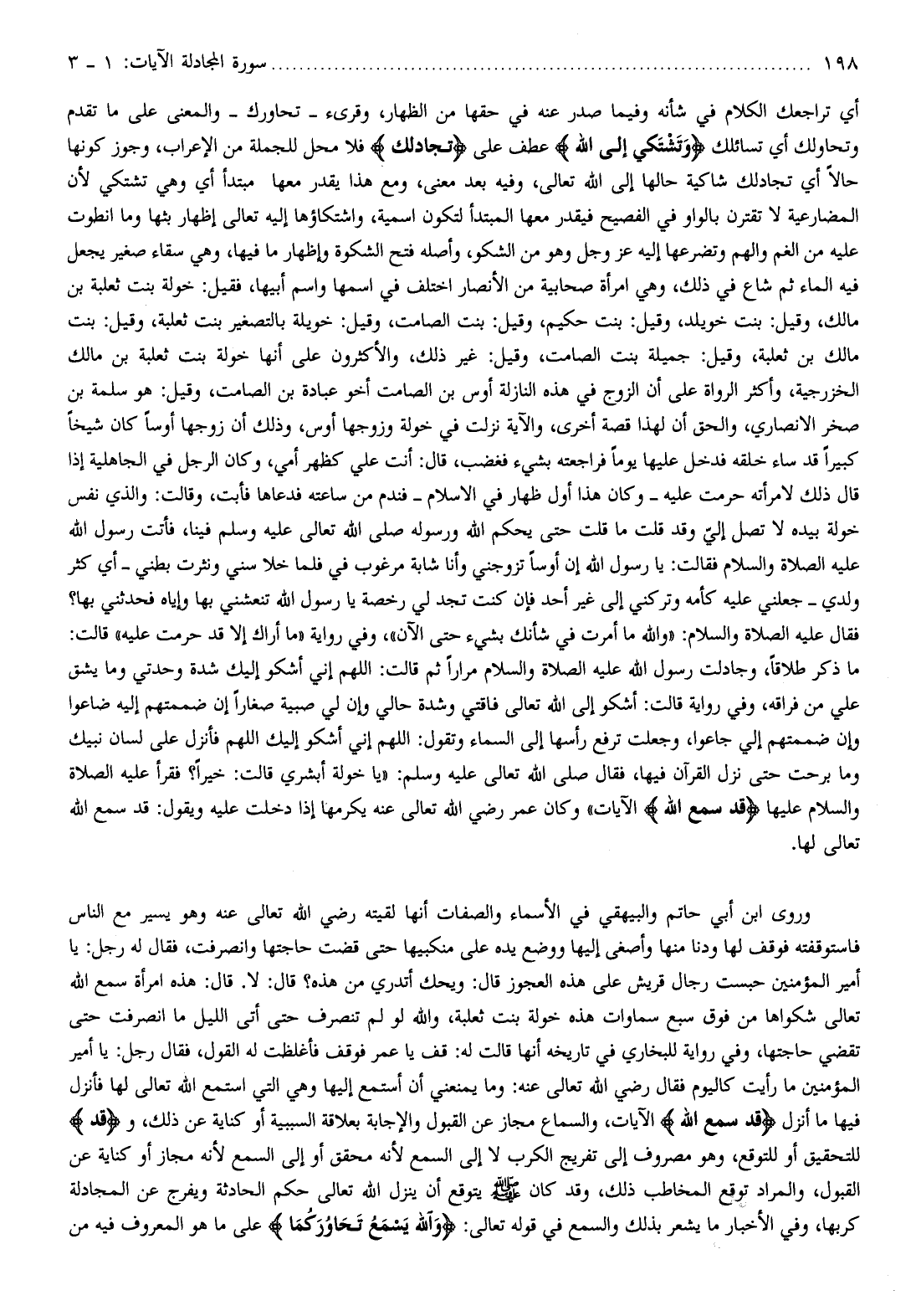 وروى ابن أبي حاتم والبيهقي في الأسماء والصفات أنها لقيته رضي الله تعالى عنه وهو يسير مع الناس فاستوقفته فوقف لها ودنا منها وأصغى إليها ووضع يده على منكبيها حتى قضت حاجتها وانصرفت، فقال له رجل: يا أمير المؤمنين حبست رجال قريش على هذه العجوز قال: ويحك أتدري من هذه؟ قال: لا. قال: هذه امرأة سمع الله تعالى شكواها من فوق سبع سماوات هذه خولة بنت ثعلبة، والله لو لم تنصرف حتى أتى الليل ما انصرفت حتى تقضي حاجتها، وفي رواية للبخاري في تاريخه أنها قالت له: قف يا عمر فوقف فأغلظت له القول، فقال رجل: يا أمير المؤمنين ما رأيت كاليوم فقال رضي الله تعالى عنه: وما يمنعني أن أستمع إليها وهي التي استمع الله تعالى لها فأنزل فيها ما أنزل قَدْ سَمِعَ اللَّهُ الآيات، والسماع مجاز عن القبول والإجابة بعلاقة السببية أو كناية عن ذلك، وقَدْ للتحقيق أو للتوقع، وهو مصروف إلى تفريج الكرب لا إلى السمع لأنه محقق أو إلى السمع لأنه مجاز أو كناية عن القبول، والمراد توقع المخاطب ذلك، وقد كان صلّى الله عليه وسلم يتوقع أن ينزل الله تعالى حكم الحادثة ويفرج عن المجادلة كربها، وفي الأخبار ما يشعر بذلك والسمع في قوله تعالى: وَاللَّهُ يَسْمَعُ تَحاوُرَكُما على ما هو المعروف فيه من