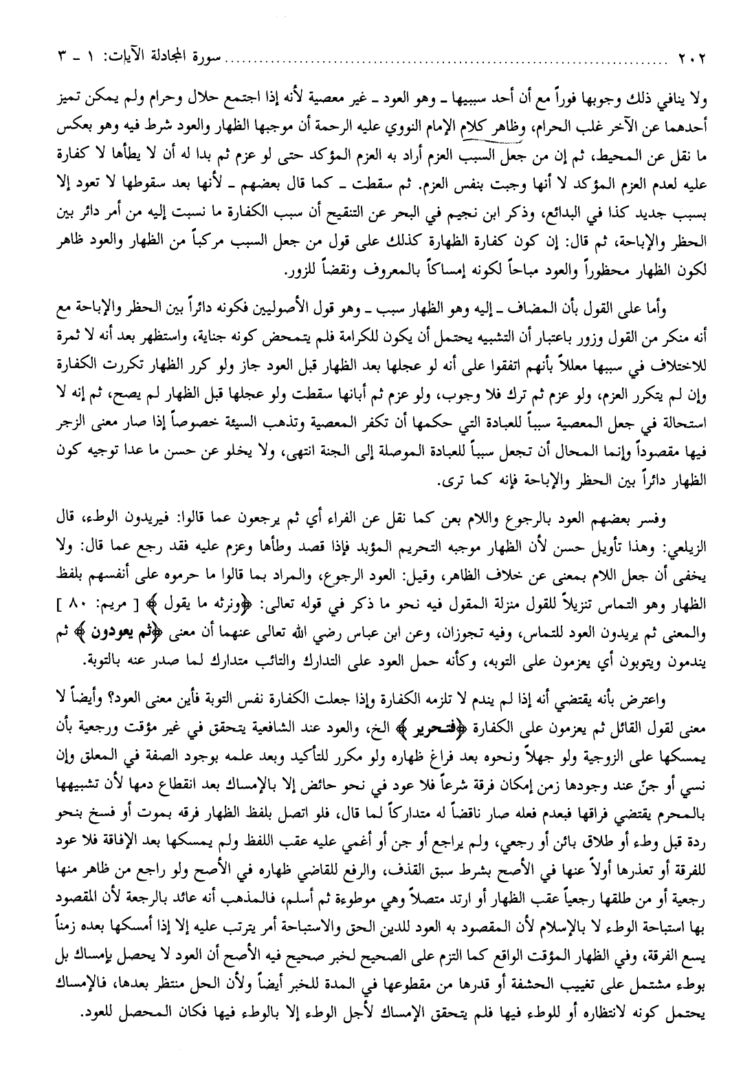 ولا ينافي ذلك وجوبها فورا مع أن أحد سببيها- وهو العود- غير معصية لأنه إذا اجتمع حلال وحرام ولم يمكن تميز أحدهما عن الآخر غلب الحرام، وظاهر كلام الإمام النووي عليه الرحمة أن موجبها الظهار والعود شرط فيه وهو بعكس ما نقل عن المحيط، ثم إن من جعل السبب العزم أراد به العزم المؤكد حتى لو عزم ثم بدا له أن لا يطأها لا كفارة عليه لعدم العزم المؤكد لا أنها وجبت بنفس العزم. ثم سقطت- كما قال بعضهم- لأنها بعد سقوطها لا تعود إلا بسبب جديد كذا في البدائع، وذكر ابن نجيم في البحر عن التنقيح أن سبب الكفارة ما نسبت إليه من أمر دائر بين الحظر والإباحة، ثم قال: إن كون كفارة الظهارة كذلك على قول من جعل السبب مركبا من الظهار والعود ظاهر لكون الظهار محظورا والعود مباحا لكونه إمساكا بالمعروف ونقضا للزور.