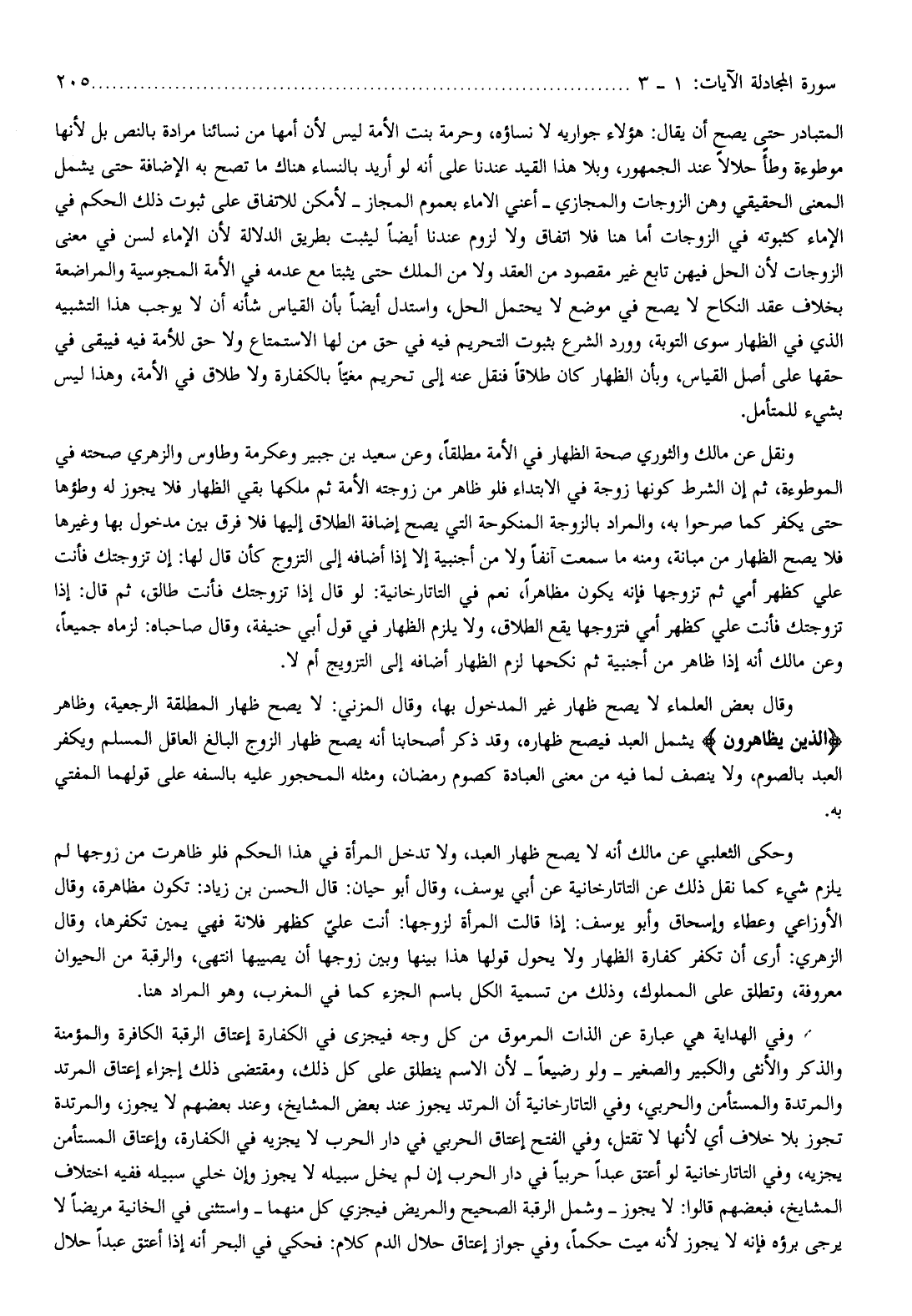 وقال بعض العلماء لا يصح ظهار غير المدخول بها، وقال المزني: لا يصح ظهار المطلقة الرجعية، وظاهر الَّذِينَ يُظاهِرُونَ يشمل العبد فيصح ظهاره، وقد ذكر أصحابنا أنه يصح ظهار الزوج البالغ العاقل المسلم ويكفر العبد بالصوم، ولا ينصف لما فيه من معنى العبادة كصوم رمضان، ومثله المحجور عليه بالسفه على قولهما المفتي به.