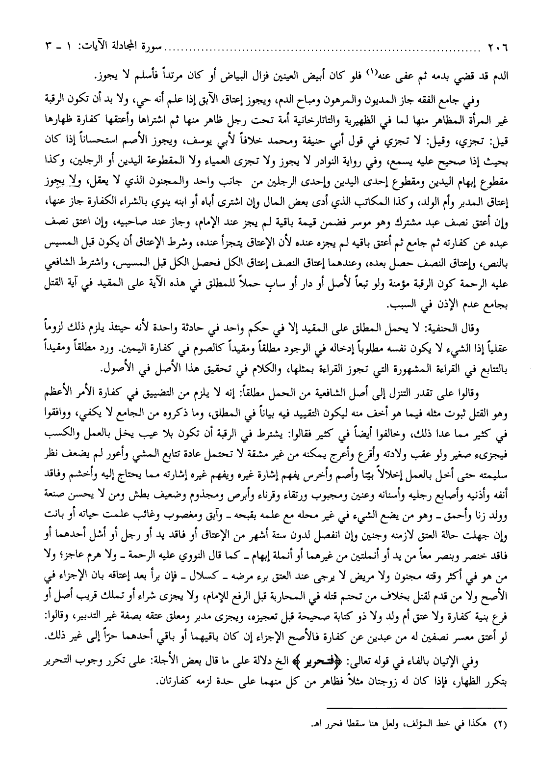 وقالوا على تقدر التنزل إلى أصل الشافعية من الحمل مطلقا: إنه لا يلزم من التضييق في كفارة الأمر الأعظم وهو القتل ثبوت مثله فيما هو أخف منه ليكون التقييد فيه بيانا في المطلق، وما ذكروه من الجامع لا يكفي، ووافقوا في كثير مما عدا ذلك، وخالفوا أيضا في كثير فقالوا: يشترط في الرقبة أن تكون بلا عيب يخل بالعمل والكسب فيجزىء صغير ولو عقب ولادته وأقرع وأعرج يمكنه من غير مشقة لا تحتمل عادة تتابع المشي وأعور لم يضعف نظر سليمته حتى أخل بالعمل إخلالا بيّنا وأصم وأخرس يفهم إشارة غيره ويفهم غيره إشارته مما يحتاج إليه وأخشم وفاقد أنفه وأذنيه وأصابع رجليه وأسنانه وعنين ومجبوب ورتقاء وقرناء وأبرص ومجذوم وضعيف بطش ومن لا يحسن صنعة وولد زنا وأحمق- وهو من يضع الشيء في غير محله مع علمه بقبحه- وآبق ومغصوب وغائب علمت حياته أو بانت وإن جهلت حالة العتق لازمنه وجنين وإن انفصل لدون ستة أشهر من الإعتاق أو فاقد يد أو رجل أو أشل أحدهما أو فاقد خنصر وبنصر معا من يد أو أنملتين من غيرهما أو أنملة إبهام- كما قال النووي عليه الرحمة- ولا هرم عاجز ولا من هو في أكثر وقته مجنون ولا مريض لا يرجى عند العتق برء مرضه- كسلال- فإن برأ بعد إعتاقه بان الإجزاء في الأصح ولا من قدم لقتل بخلاف من تحتم قتله في المحاربة قبل الرفع للإمام، ولا يجزى شراء أو تملك قريب أصل أو فرع بنية كفارة ولا عتق أم ولد ولا ذو كتابة صحيحة قبل تعجيزه، ويجزى مدبر ومعلق عتقه بصفة غير التدبير، وقالوا: