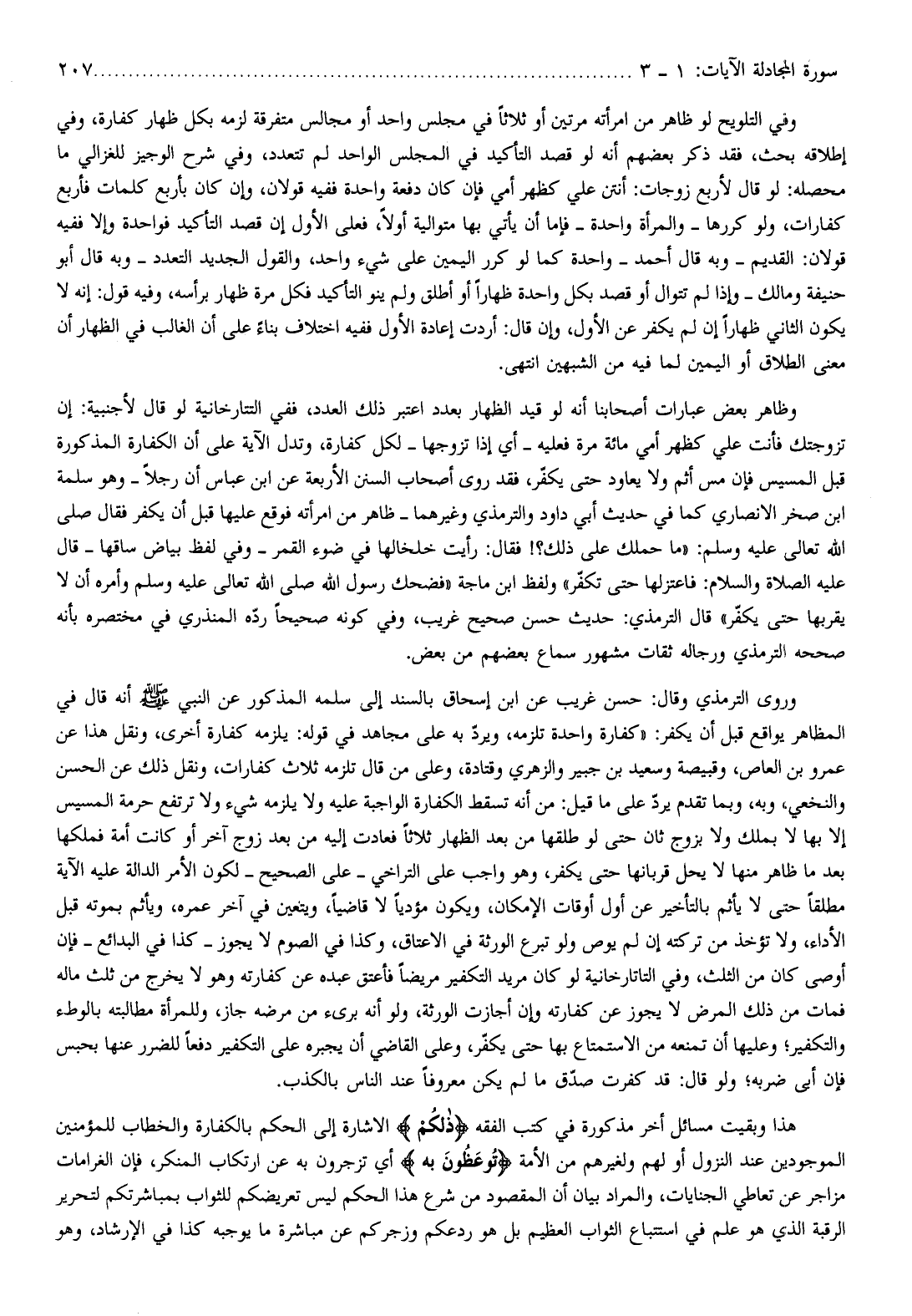 ، ويردّ به على مجاهد في قوله: يلزمه كفارة أخرى، ونقل هذا عن عمرو بن العاص، وقبيصة وسعيد بن جبير والزهري وقتادة، وعلى من قال تلزمه ثلاث كفارات، ونقل ذلك عن الحسن والنخعي، وبه، وبما تقدم يردّ على ما قيل: من أنه تسقط الكفارة الواجبة عليه ولا يلزمه شيء ولا ترتفع حرمة المسيس إلا بها لا بملك ولا بزوج ثان حتى لو طلقها من بعد الظهار ثلاثا فعادت إليه من بعد زوج آخر أو كانت أمة فملكها بعد ما ظاهر منها لا يحل قربانها حتى يكفر، وهو واجب على التراخي- على الصحيح- لكون الأمر الدالة عليه الآية مطلقا حتى لا يأثم بالتأخير عن أول أوقات الإمكان، ويكون مؤديا لا قاضيا، ويتعين في آخر عمره، ويأثم بموته قبل الأداء، ولا تؤخذ من تركته إن لم يوص ولو تبرع الورثة في الاعتاق، وكذا في الصوم لا يجوز- كذا في البدائع- فإن أوصى كان من الثلث، وفي التاتارخانية لو كان مريد التكفير مريضا فأعتق عبده عن كفارته وهو لا يخرج من ثلث ماله فمات من ذلك المرض لا يجوز عن كفارته وإن أجازت الورثة، ولو أنه برىء من مرضه جاز، وللمرأة مطالبته بالوطء والتكفير وعليها أن تمنعه من الاستمتاع بها حتى يكفّر، وعلى القاضي أن يجبره على التكفير دفعا للضرر عنها بحبس فإن أبى ضربه ولو قال: قد كفرت صدّق ما لم يكن معروفا عند الناس بالكذب.