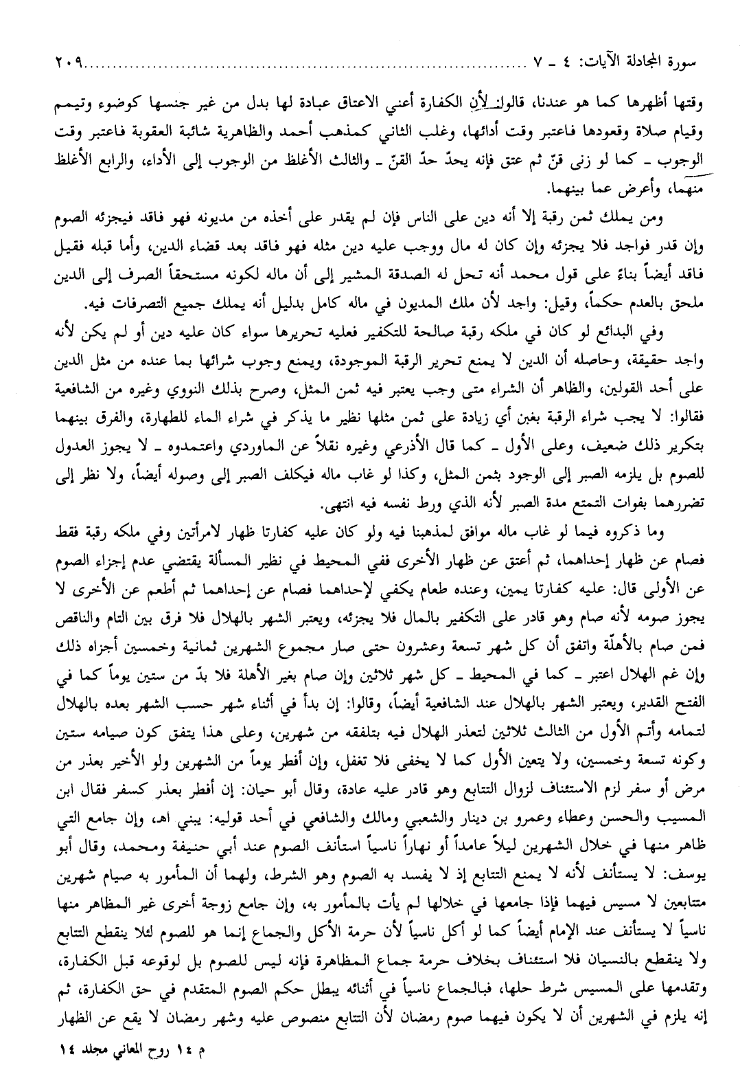 وفي البدائع لو كان في ملكه رقبة صالحة للتكفير فعليه تحريرها سواء كان عليه دين أو لم يكن لأنه واجد حقيقة، وحاصله أن الدين لا يمنع تحرير الرقبة الموجودة، ويمنع وجوب شرائها بما عنده من مثل الدين على أحد القولين، والظاهر أن الشراء متى وجب يعتبر فيه ثمن المثل، وصرح بذلك النووي وغيره من الشافعية فقالوا: لا يجب شراء الرقبة بغبن أي زيادة على ثمن مثلها نظير ما يذكر في شراء الماء للطهارة، والفرق بينهما بتكرير ذلك ضعيف، وعلى الأول- كما قال الأذرعي وغيره نقلا عن الماوردي واعتمدوه- لا يجوز العدول للصوم بل يلزمه الصبر إلى الوجود بثمن المثل، وكذا لو غاب ماله فيكلف الصبر إلى وصوله أيضا، ولا نظر إلى تضررهما بفوات التمتع مدة الصبر لأنه الذي ورط نفسه فيه انتهى.