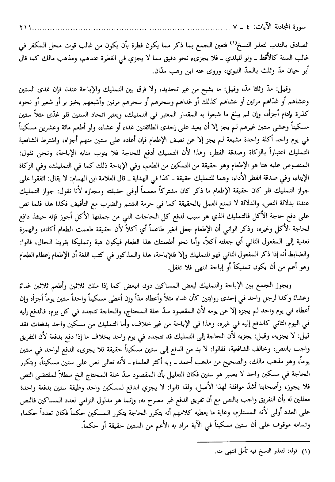 ويجوز الجمع بين الإباحة والتمليك لبعض المساكين دون البعض كما إذا ملك ثلاثين وأطعم ثلاثين غداء وعشاء وكذا لرجل واحد في إحدى روايتين كأن غداه مثلا وأعطاه مدّا وإن أعطى مسكينا واحدا ستين يوما أجزأه وإن أعطاه في يوم واحد لم يجزه إلا عن يومه لأن المقصود سدّ خلة المحتاج، والحاجة تتجدد في كل يوم، فالدفع إليه في اليوم الثاني كالدفع إليه في غيره، وهذا في الإباحة من غير خلاف، وأما التمليك من مسكين واحد بدفعات فقد قيل: لا يجزيه، وقيل: يجزيه لأن الحاجة إلى التمليك قد تتجدد في يوم واحد بخلاف ما إذا دفع بدفعة لأن التفريق واجب بالنص، وخالف الشافعية، فقالوا: لا بد من الدفع إلى ستين مسكينا حقيقة فلا يجزىء الدفع لواحد في ستين يوما، وهو مذهب مالك، والصحيح من مذهب أحمد- وبه أكثر العلماء- لأنه تعالى نص على ستين مسكينا، ويتكرر الحاجة في مسكين واحد لا يصير هو ستين فكان التعليل بأن المقصود سدّ خلة المحتاج إلخ مبطلا لمقتضى النص فلا يجوز، وأصحابنا أشدّ موافقة لهذا الأصل، ولذا قالوا: لا يجزي الدفع لمسكين واحد وظيفة ستين بدفعة واحدة معللين له بأن التفريق واجب بالنص مع أن تفريق الدفع غير مصرح به، وإنما هو مدلول التزامي لعدد المساكين فالنص على العدد أولى لأنه المستلزم، وغاية ما يعطيه كلامهم أنه بتكرر الحاجة يتكرر المسكين حكما فكان تعددا حكما، وتمامه موقوف على أن ستين مسكينا في الآية مراد به الأعم من الستين حقيقة أو حكما.