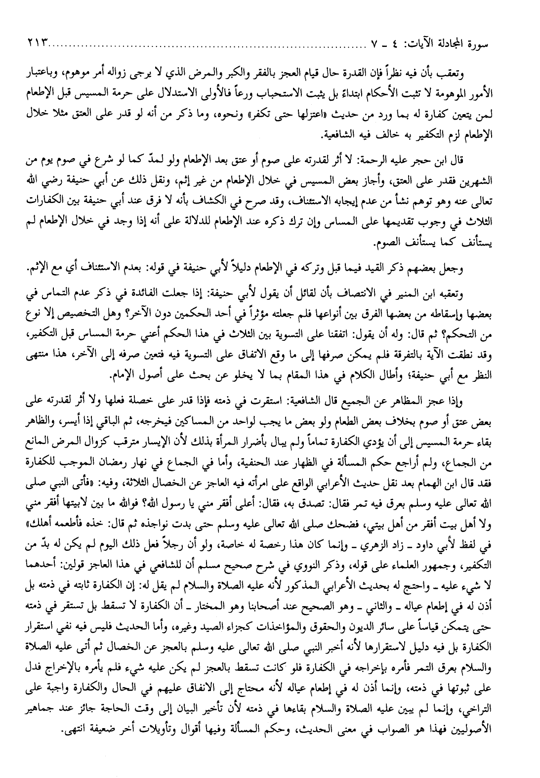 وتعقبه ابن المنير في الانتصاف بأن لقائل أن يقول لأبي حنيفة: إذا جعلت الفائدة في ذكر عدم التماس في بعضها وإسقاطه من بعضها الفرق بين أنواعها فلم جعلته مؤثرا في أحد الحكمين دون الآخر؟ وهل التخصيص إلا نوع من التحكم؟ ثم قال: وله أن يقول: اتفقنا على التسوية بين الثلاث في هذا الحكم أعني حرمة المساس قبل التكفير، وقد نطقت الآية بالتفرقة فلم يمكن صرفها إلى ما وقع الاتفاق على التسوية فيه فتعين صرفه إلى الآخر، هذا منتهى النظر مع أبي حنيفة وأطال الكلام في هذا المقام بما لا يخلو عن بحث على أصول الإمام.