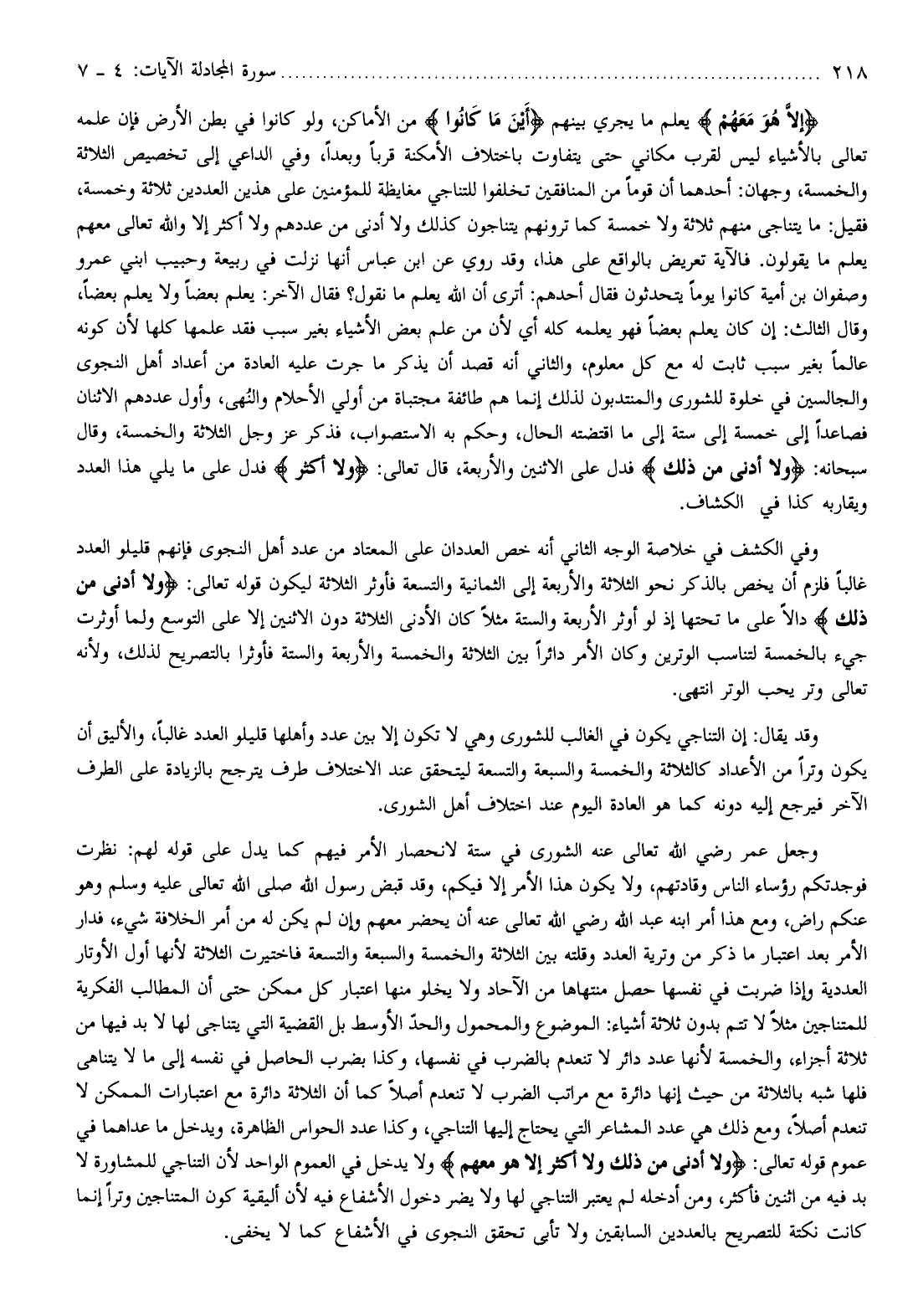 إِلَّا هُوَ مَعَهُمْ يعلم ما يجري بينهم أَيْنَ ما كانُوا من الأماكن، ولو كانوا في بطن الأرض فإن علمه تعالى بالأشياء ليس لقرب مكاني حتى يتفاوت باختلاف الأمكنة قربا وبعدا، وفي الداعي إلى تخصيص الثلاثة والخمسة، وجهان: أحدهما أن قوما من المنافقين تخلفوا للتناجي مغايظة للمؤمنين على هذين العددين ثلاثة وخمسة، فقيل: ما يتناجى منهم ثلاثة ولا خمسة كما ترونهم يتناجون كذلك ولا أدنى من عددهم ولا أكثر إلا والله تعالى معهم يعلم ما يقولون. فالآية تعريض بالواقع على هذا، وقد روي عن ابن عباس أنها نزلت في ربيعة وحبيب ابني عمرو وصفوان بن أمية كانوا يوما يتحدثون فقال أحدهم: أترى أن الله يعلم ما نقول؟ فقال الآخر: يعلم بعضا ولا يعلم بعضا، وقال الثالث: إن كان يعلم بعضا فهو يعلمه كله أي لأن من علم بعض الأشياء بغير سبب فقد علمها كلها لأن كونه عالما بغير سبب ثابت له مع كل معلوم، والثاني أنه قصد أن يذكر ما جرت عليه العادة من أعداد أهل النجوى والجالسين في خلوة للشورى والمنتدبون لذلك إنما هم طائفة مجتباة من أولي الأحلام والنهى، وأول عددهم الاثنان فصاعدا إلى خمسة إلى ستة إلى ما اقتضته الحال، وحكم به الاستصواب، فذكر عز وجل الثلاثة والخمسة، وقال سبحانه: وَلا أَدْنى مِنْ ذلِكَ فدل على الاثنين والأربعة، قال تعالى: وَلا أَكْثَرَ فدل على ما يلي هذا العدد ويقاربه كذا في الكشاف.