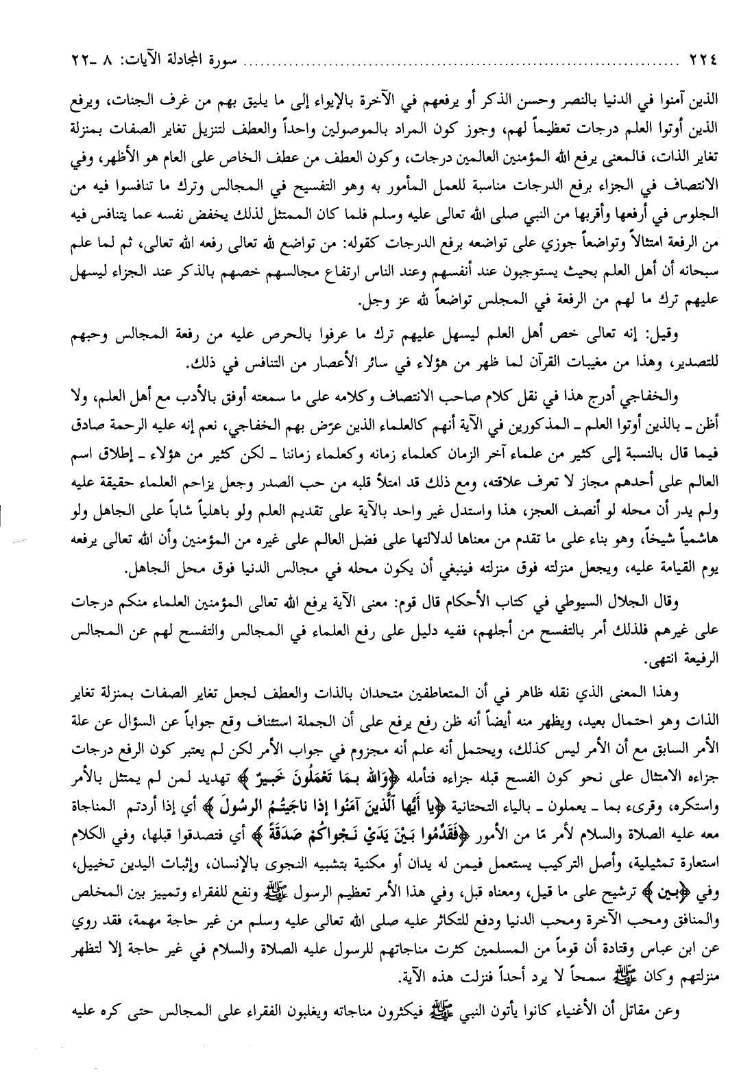وقال الجلال السيوطي في كتاب الأحكام قال قوم: معنى الآية يرفع الله تعالى المؤمنين العلماء منكم درجات على غيرهم فلذلك أمر بالتفسح من أجلهم، ففيه دليل على رفع العلماء في المجالس والتفسح لهم عن المجالس الرفيعة انتهى.
