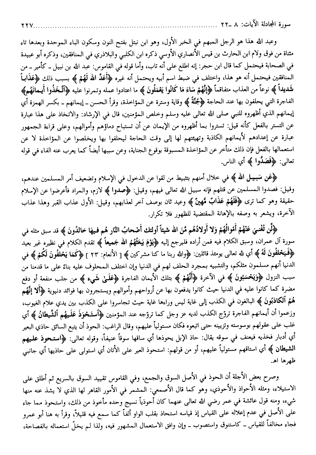 لَنْ تُغْنِيَ عَنْهُمْ أَمْوالُهُمْ وَلا أَوْلادُهُمْ مِنَ اللَّهِ شَيْئاً أُولئِكَ أَصْحابُ النَّارِ هُمْ فِيها خالِدُونَ قد سبق مثله في سورة آل عمران، وسبق الكلام فيه فمن أراده فليرجع إليه يَوْمَ يَبْعَثُهُمُ اللَّهُ جَمِيعاً تقدم الكلام في نظيره غير بعيد فَيَحْلِفُونَ لَهُ أي لله تعالى يومئذ قائلين: وَاللَّهِ رَبِّنا ما كُنَّا مُشْرِكِينَ [الأنعام: 23] كَما يَحْلِفُونَ لَكُمْ في الدنيا أنهم مسلمون مثلكم، والتشبيه بمجرد الحلف لهم في الدنيا وإن اختلف المحلوف عليه بناء على ما قدمنا من سبب النزول وَيَحْسَبُونَ في الآخرة أَنَّهُمْ بتلك الأيمان الفاجرة عَلى شَيْءٍ من جلب منفعة أو دفع مضرة كما كانوا عليه في الدنيا حيث كانوا يدفعون بها عن أرواحهم وأموالهم ويستجرون بها فوائد دنيوية أَلا إِنَّهُمْ هُمُ الْكاذِبُونَ البالغون في الكذب إلى غاية ليس وراءها غاية حيث تجاسروا على الكذب بين يدي علام الغيوب، وزعموا أن أيمانهم الفاجرة تروّج الكذب لديه عز وجل كما تروّجه عند المؤمنين اسْتَحْوَذَ عَلَيْهِمُ الشَّيْطانُ أي غلب على عقولهم بوسوسته وتزيينه حتى اتبعوه فكان مستوليا عليهم، وقال الراغب: الحوذ أن يتبع السائق حاذي البعير أي أدبار فخذيه فيعنف في سوقه يقال: حاذ الإبل يحوذها أي ساقها سوقا عنيفا، وقوله تعالى: اسْتَحْوَذَ عَلَيْهِمُ الشَّيْطانُ أي استاقهم مستوليا عليهم، أو من قولهم: استحوذ العير على الأتان أي استولى على حاذيها أي جانبي ظهرها اه.