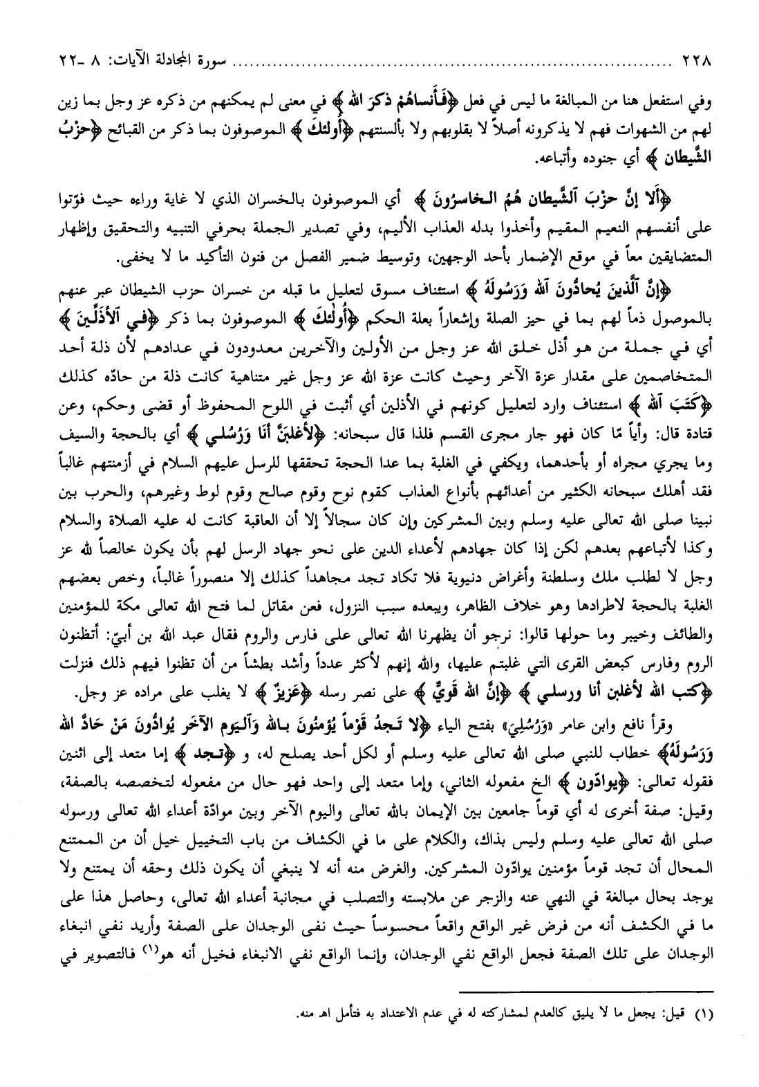 إِنَّ الَّذِينَ يُحَادُّونَ اللَّهَ وَرَسُولَهُ استئناف مسوق لتعليل ما قبله من خسران حزب الشيطان عبر عنهم بالموصول ذما لهم بما في حيز الصلة وإشعارا بعلة الحكم أُولئِكَ الموصوفون بما ذكر فِي الْأَذَلِّينَ أي في جملة من هو أذل خلق الله عز وجل من الأولين والآخرين معدودون في عدادهم لأن ذلة أحد المتخاصمين على مقدار عزة الآخر وحيث كانت عزة الله عز وجل غير متناهية كانت ذلة من حادّه كذلك كَتَبَ اللَّهُ استئناف وارد لتعليل كونهم في الأذلين أي أثبت في اللوح المحفوظ أو قضى وحكم، وعن قتادة قال: وأيا ما كان فهو جار مجرى القسم فلذا قال سبحانه: لَأَغْلِبَنَّ أَنَا وَرُسُلِي أي بالحجة والسيف وما يجري مجراه أو بأحدهما، ويكفي في الغلبة بما عدا الحجة تحققها للرسل عليهم السلام في أزمنتهم غالبا فقد أهلك سبحانه الكثير من أعدائهم بأنواع العذاب كقوم نوح وقوم صالح وقوم لوط وغيرهم، والحرب بين نبينا صلّى الله تعالى عليه وسلم وبين المشركين وإن كان سجالا إلا أن العاقبة كانت له عليه الصلاة والسلام وكذا لأتباعهم بعدهم لكن إذا كان جهادهم لأعداء الدين على نحو جهاد الرسل لهم بأن يكون خالصا لله عز وجل لا لطلب ملك وسلطنة وأغراض دنيوية فلا تكاد تجد مجاهدا كذلك إلا منصورا غالبا، وخص بعضهم الغلبة بالحجة لا طرادها وهو خلاف الظاهر، ويبعده سبب النزول، فعن مقاتل لما فتح الله تعالى مكة للمؤمنين والطائف وخيبر وما حولها قالوا: نرجو أن يظهرنا الله تعالى على فارس والروم فقال عبد الله بن أبيّ: أتظنون الروم وفارس كبعض القرى التي غلبتم عليها، والله إنهم لأكثر عددا وأشد بطشا من أن تظنوا فيهم ذلك فنزلت كَتَبَ اللَّهُ لَأَغْلِبَنَّ أَنَا وَرُسُلِي إِنَّ اللَّهَ قَوِيٌّ على نصر رسله عَزِيزٌ لا يغلب على مراده عز وجل.
