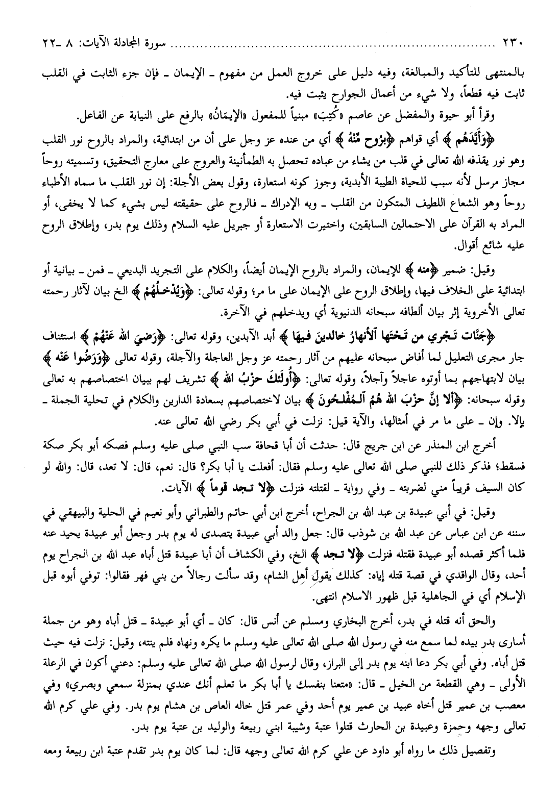 وَأَيَّدَهُمْ أي قواهم بِرُوحٍ مِنْهُ أي من عنده عز وجل على أن من ابتدائية، والمراد بالروح نور القلب وهو نور يقذفه الله تعالى في قلب من يشاء من عباده تحصل به الطمأنينة والعروج على معارج التحقيق، وتسميته روحا مجاز مرسل لأنه سبب للحياة الطيبة الأبدية، وجوز كونه استعارة، وقول بعض الأجلة: إن نور القلب ما سماه الأطباء روحا وهو الشعاع اللطيف المتكون من القلب- وبه الإدراك- فالروح على حقيقته ليس بشيء كما لا يخفى، أو المراد به القرآن على الاحتمالين السابقين، واختيرت الاستعارة أو جبريل عليه السلام وذلك يوم بدر، وإطلاق الروح عليه شائع أقوال.