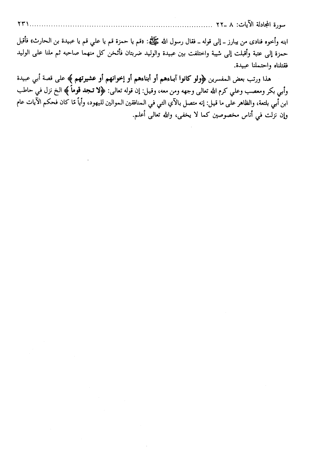 هذا ورتب بعض المفسرين وَلَوْ كانُوا آباءَهُمْ أَوْ أَبْناءَهُمْ أَوْ إِخْوانَهُمْ أَوْ عَشِيرَتَهُمْ على قصة أبي عبيدة وأبي بكر ومعصب وعلي كرم الله تعالى وجهه ومن معه، وقيل: إن قوله تعالى: لا تَجِدُ قَوْماً إلخ نزل في حاطب ابن أبي بلتعة، والظاهر على ما قيل: إنه متصل بالآي التي في المنافقين الموالين لليهود، وأيا ما كان فحكم الآيات عام وإن نزلت في أناس مخصوصين كما لا يخفى، والله تعالى أعلم.