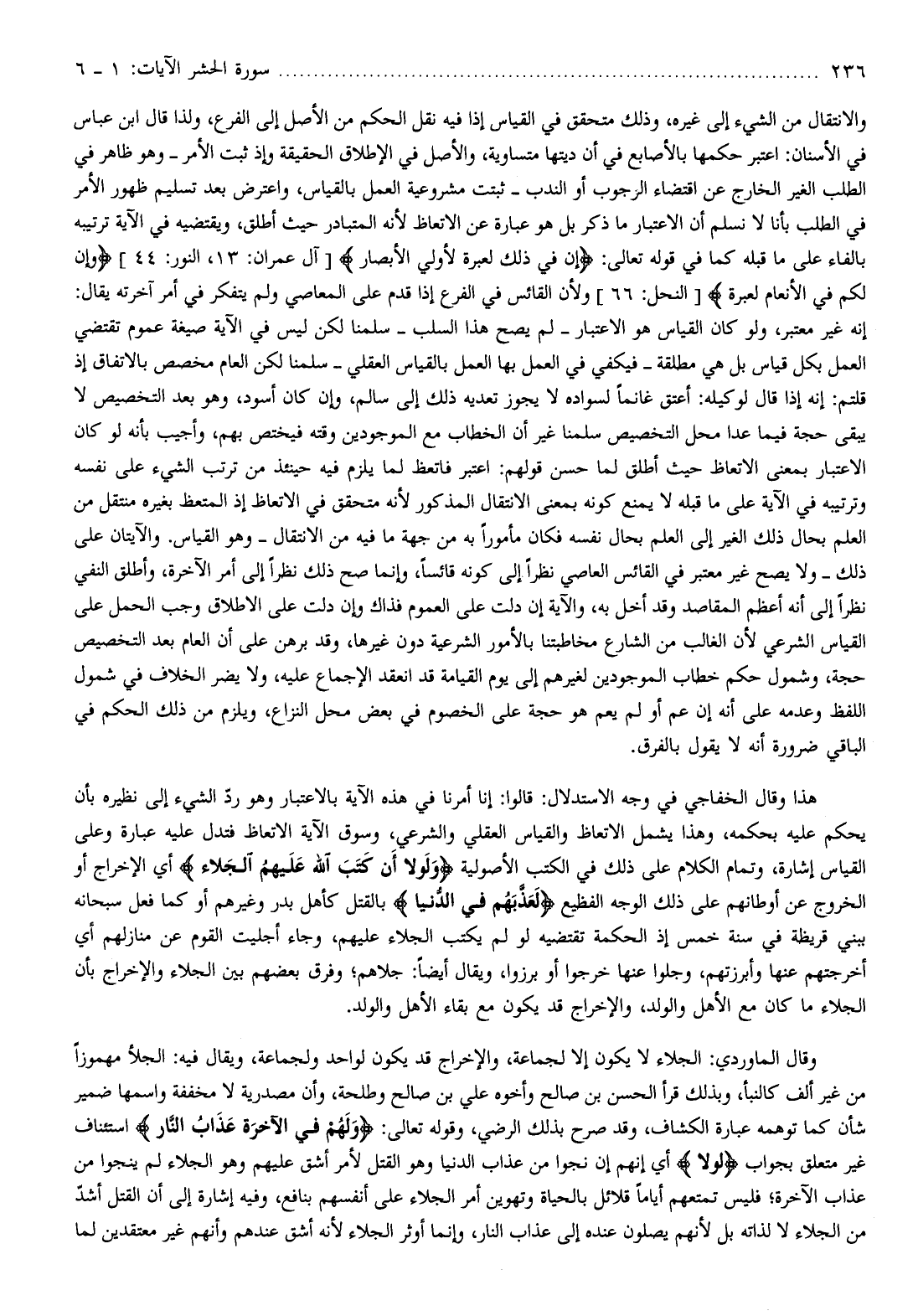 هذا وقال الخفاجي في وجه الاستدلال: قالوا: إنا أمرنا في هذه الآية بالاعتبار وهو ردّ الشيء إلى نظيره بأن يحكم عليه بحكمه، وهذا يشمل الاتعاظ والقياس العقلي والشرعي، وسوق الآية الاتعاظ فتدل عليه عبارة وعلى القياس إشارة، وتمام الكلام على ذلك في الكتب الأصولية وَلَوْلا أَنْ كَتَبَ اللَّهُ عَلَيْهِمُ الْجَلاءَ أي الإخراج أو الخروج عن أوطانهم على ذلك الوجه الفظيع لَعَذَّبَهُمْ فِي الدُّنْيا بالقتل كأهل بدر وغيرهم أو كما فعل سبحانه ببني قريظة في سنة خمس إذ الحكمة تقتضيه لو لم يكتب الجلاء عليهم، وجاء أجليت القوم عن منازلهم أي أخرجتهم عنها وأبرزتهم، وجلوا عنها خرجوا أو برزوا، ويقال أيضا: جلاهم وفرق بعضهم بين الجلاء والإخراج بأن الجلاء ما كان مع الأهل والولد، والإخراج قد يكون مع بقاء الأهل والولد.