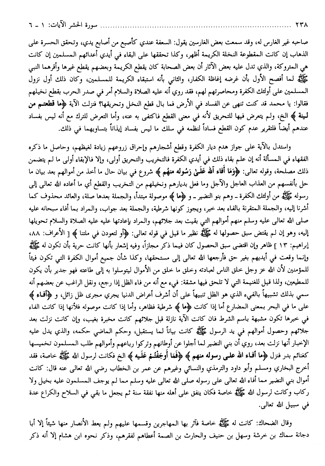 واستدل بالآية على جواز هدم ديار الكفرة وقطع أشجارهم وإحراق زروعهم زيادة لغيظهم، وحاصل ما ذكره الفقهاء في المسألة أنه إن علم بقاء ذلك في أيدي الكفرة فالتخريب والتحريق أولى، وإلا فالإبقاء أولى ما لم يتضمن ذلك مصلحة، وقوله تعالى: وَما أَفاءَ اللَّهُ عَلى رَسُولِهِ مِنْهُمْ شروع في بيان حال ما أخذ من أموالهم بعد بيان ما حل بأنفسهم من العذاب العاجل والآجل وما فعل بديارهم ونخيلهم من التخريب والقطع أي ما أعاده الله تعالى إلى رسوله صلّى الله عليه وسلم من أولئك الكفرة- وهم بنو النضير- وما موصولة مبتدأ، والجملة بعدها صلة، والعائد محذوف كما أشرنا إليه، والجملة المتقرنة بالفاء بعد خبر، ويجوز كونها شرطية، والجملة بعد جواب، والمراد بما أفاء سبحانه عليه صلى الله تعالى عليه وسلم منهم أموالهم التي بقيت بعد جلائهم، والمراد بإعادتها عليه الصلاة والسلام تحويلها إليه، وهو إن لم يقتض سبق حصولها له صلّى الله عليه وسلم نظير ما قيل في قوله تعالى: أَوْ لَتَعُودُنَّ فِي مِلَّتِنا [الأعراف: 88، إبراهيم: 13] ظاهر وإن اقتضى سبق الحصول كان فيما ذكر مجازا، وفيه إشعار بأنها كانت حرية بأن تكون له صلّى الله عليه وسلم وإنما وقعت في أيديهم بغير حق فأرجعها الله تعالى إلى مستحقها، وكذا شأن جميع أموال الكفرة التي تكون فيئا للمؤمنين لأن الله عز وجل خلق الناس لعبادته وخلق ما خلق من الأموال ليتوسلوا به إلى طاعته فهو جدير بأن يكون للمطيعين، ولذا قيل للغنيمة التي لا تلحق فيها مشقة: فيء مع أنه من فاء الظل إذا رجع، ونقل الراغب عن بعضهم أنه سمي بذلك تشبيها بالفيء الذي هو الظل تنبيها على أن أشرف أعراض الدنيا يجري مجرى ظل زائل، وأَفاءَ على ما في البحر بمعنى المضارع أما إذا كانت ما شرطية فظاهر، وأما إذا كانت موصوله فلأنها إذا كانت الفاء في خبرها تكون مشبهة باسم الشرط فان كانت الآية نازلة قبل جلائهم كانت مخبرة بغيب، وإن كانت نزلت بعد جلائهم وحصول أموالهم في يد الرسول صلّى الله عليه وسلم كانت بيانا لما يستقبل، وحكم الماضي حكمه، والذي يدل عليه الإخبار أنها نزلت بعد، روي أن بني النضير لما أجلوا عن أوطانهم وتركوا رباعهم وأموالهم طلب المسلمون تخميسها كغنائم بدر فنزل ما أَفاءَ اللَّهُ عَلى رَسُولِهِ مِنْهُمْ فَما أَوْجَفْتُمْ عَلَيْهِ إلخ فكانت لرسول الله صلّى الله عليه وسلم خاصة، فقد أخرج البخاري ومسلم وأبو داود والترمذي والنسائي وغيرهم عن عمر بن الخطاب رضي الله تعالى عنه قال: كانت أموال بني النضير مما أفاء الله تعالى على رسوله صلّى الله تعالى عليه وسلم مما لم يوجف المسلمون عليه بخيل ولا ركاب وكانت لرسول الله صلّى الله عليه وسلم خاصة فكان ينفق على أهله منها نفقة سنة ثم يجعل ما بقي في السلاح والكراع عدة في سبيل الله تعالى.
