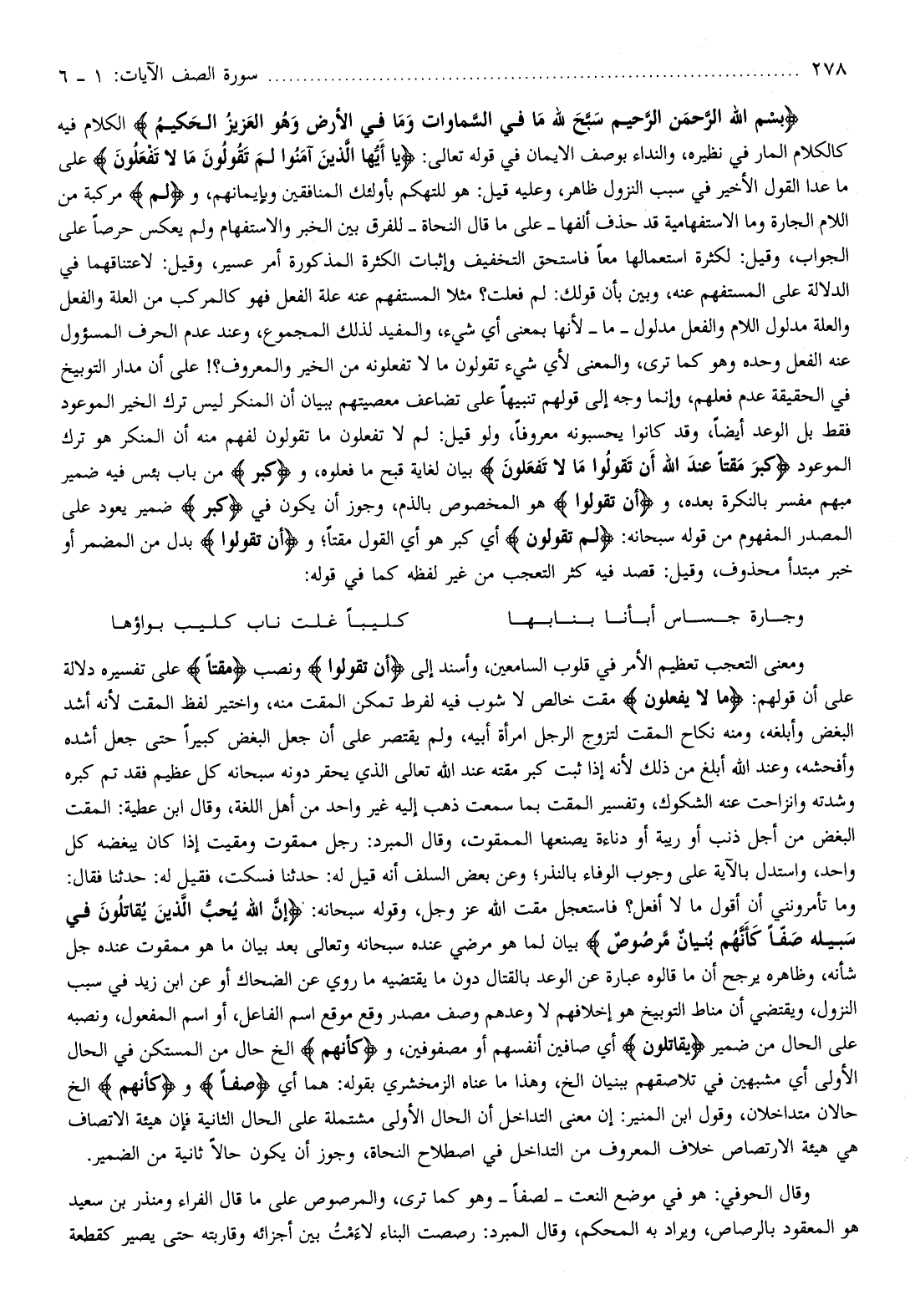 بِسْمِ اللَّهِ الرَّحْمنِ الرَّحِيمِ سَبَّحَ لِلَّهِ ما فِي السَّماواتِ وَما فِي الْأَرْضِ وَهُوَ الْعَزِيزُ الْحَكِيمُ الكلام فيه كالكلام المار في نظيره، والنداء بوصف الايمان في قوله تعالى: يا أَيُّهَا الَّذِينَ آمَنُوا لِمَ تَقُولُونَ ما لا تَفْعَلُونَ على ما عدا القول الأخير في سبب النزول ظاهر، وعليه قيل: هو للتهكم بأولئك المنافقين وبإيمانهم، ولِمَ مركبة من اللام الجارة وما الاستفهامية قد حذف ألفها- على ما قال النحاة- للفرق بين الخبر والاستفهام ولم يعكس حرصا على الجواب، وقيل: لكثرة استعمالها معا فاستحق التخفيف وإثبات الكثرة المذكورة أمر عسير، وقيل: لاعتناقهما في الدلالة على المستفهم عنه، وبين بأن قولك: لم فعلت؟ مثلا المستفهم عنه علة الفعل فهو كالمركب من العلة والفعل والعلة مدلول اللام والفعل مدلول- ما- لأنها بمعنى أي شيء، والمفيد لذلك المجموع، وعند عدم الحرف المسئول عنه الفعل وحده وهو كما ترى، والمعنى لأي شيء تقولون ما لا تفعلونه من الخير والمعروف؟! على أن مدار التوبيخ في الحقيقة عدم فعلهم، وإنما وجه إلى قولهم تنبيها على تضاعف معصيتهم ببيان أن المنكر ليس ترك الخير الموعود فقط بل الوعد أيضا، وقد كانوا يحسبونه معروفا، ولو قيل: لم لا تفعلون ما تقولون لفهم منه أن المنكر هو ترك الموعود كَبُرَ مَقْتاً عِنْدَ اللَّهِ أَنْ تَقُولُوا ما لا تَفْعَلُونَ بيان لغاية قبح ما فعلوه، وكَبُرَ من باب بئس فيه ضمير مبهم مفسر بالنكرة بعده، وأَنْ تَقُولُوا هو المخصوص بالذم، وجوز أن يكون في كَبُرَ ضمير يعود على المصدر المفهوم من قوله سبحانه: لِمَ تَقُولُونَ أي كبر هو أي القول مقتا وأَنْ تَقُولُوا بدل من المضمر أو خبر مبتدأ محذوف، وقيل: قصد فيه كثر التعجب من غير لفظه كما في قوله: