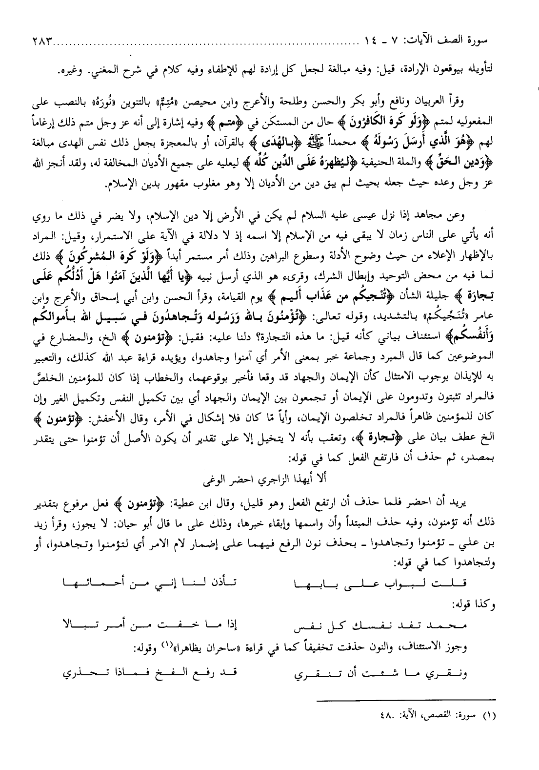 ألا أيهذا الزاجري احضر الوغى يريد أن احضر فلما حذف أن ارتفع الفعل وهو قليل، وقال ابن عطية: تُؤْمِنُونَ فعل مرفوع بتقدير ذلك أنه تؤمنون، وفيه حذف المبتدأ وأن واسمها وإبقاء خبرها، وذلك على ما قال أبو حيان: لا يجوز، وقرأ زيد بن علي- تؤمنوا وتجاهدوا- بحذف نون الرفع فيهما على إضمار لام الأمر أي لتؤمنوا وتجاهدوا، أو ولتجاهدوا كما في قوله: