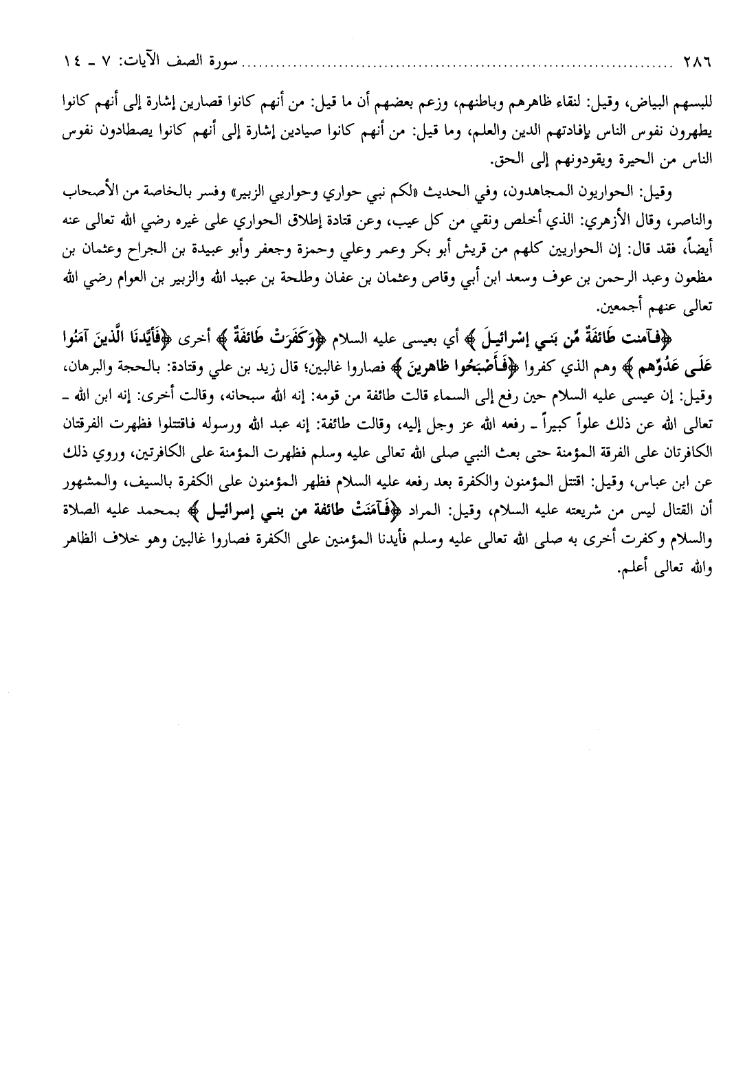 فَآمَنَتْ طائِفَةٌ مِنْ بَنِي إِسْرائِيلَ أي بعيسى عليه السلام وَكَفَرَتْ طائِفَةٌ أخرى فَأَيَّدْنَا الَّذِينَ آمَنُوا عَلى عَدُوِّهِمْ وهم الذي كفروا فَأَصْبَحُوا ظاهِرِينَ فصاروا غالبين قال زيد بن علي وقتادة: بالحجة والبرهان، وقيل: إن عيسى عليه السلام حين رفع إلى السماء قالت طائفة من قومه: إنه الله سبحانه، وقالت أخرى: إنه ابن الله- تعالى الله عن ذلك علوا كبيرا- رفعه الله عز وجل إليه، وقالت طائفة: إنه عبد الله ورسوله فاقتتلوا فظهرت الفرقتان الكافرتان على الفرقة المؤمنة حتى بعث النبي صلّى الله تعالى عليه وسلم فظهرت المؤمنة على الكافرتين، وروي ذلك عن ابن عباس، وقيل: اقتتل المؤمنون والكفرة بعد رفعه عليه السلام فظهر المؤمنون على الكفرة بالسيف، والمشهور أن القتال ليس من شريعته عليه السلام، وقيل: المراد فَآمَنَتْ طائِفَةٌ مِنْ بَنِي إِسْرائِيلَ بمحمد عليه الصلاة والسلام وكفرت أخرى به صلّى الله تعالى عليه وسلم فأيدنا المؤمنين على الكفرة فصاروا غالبين وهو خلاف الظاهر والله تعالى أعلم.