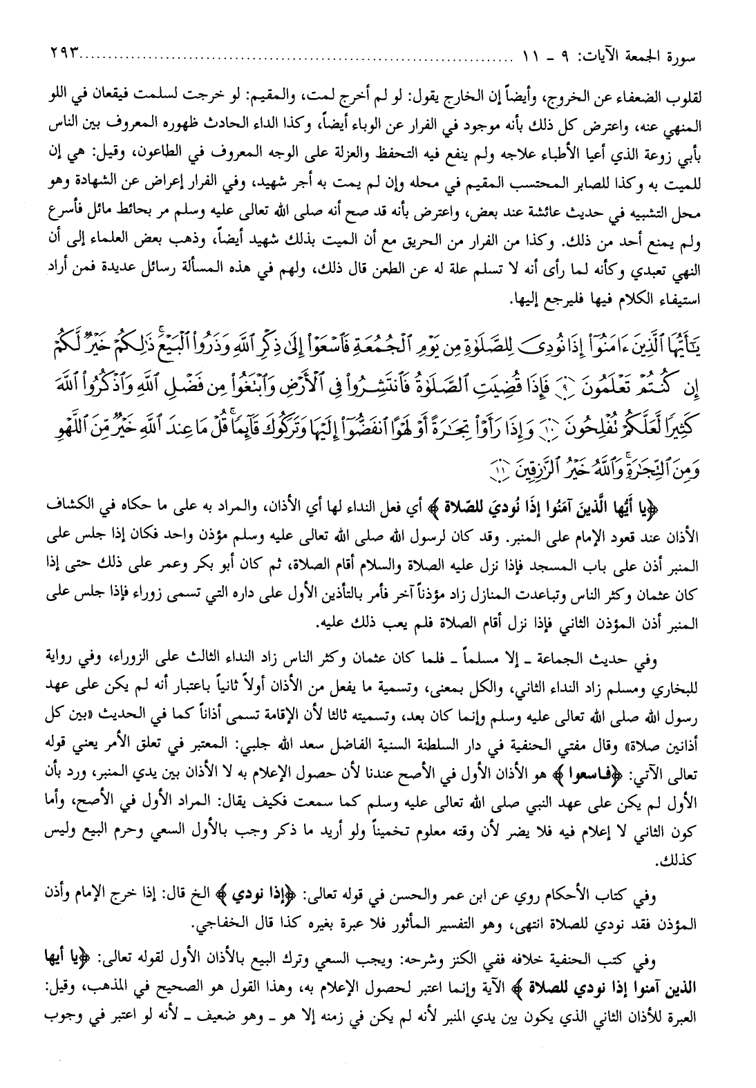 وقال مفتي الحنفية في دار السلطنة السنية الفاضل سعد الله جلبي: المعتبر في تعلق الأمر يعني قوله تعالى الآتي: فَاسْعَوْا هو الأذان الأول في الأصح عندنا لأن حصول الإعلام به لا الأذان بين يدي المنبر، ورد بأن الأول لم يكن على عهد النبي صلّى الله تعالى عليه وسلم كما سمعت فكيف يقال: المراد الأول في الأصح، وأما كون الثاني لا إعلام فيه فلا يضر لأن وقته معلوم تخمينا ولو أريد ما ذكر وجب بالأول السعي وحرم البيع وليس كذلك.