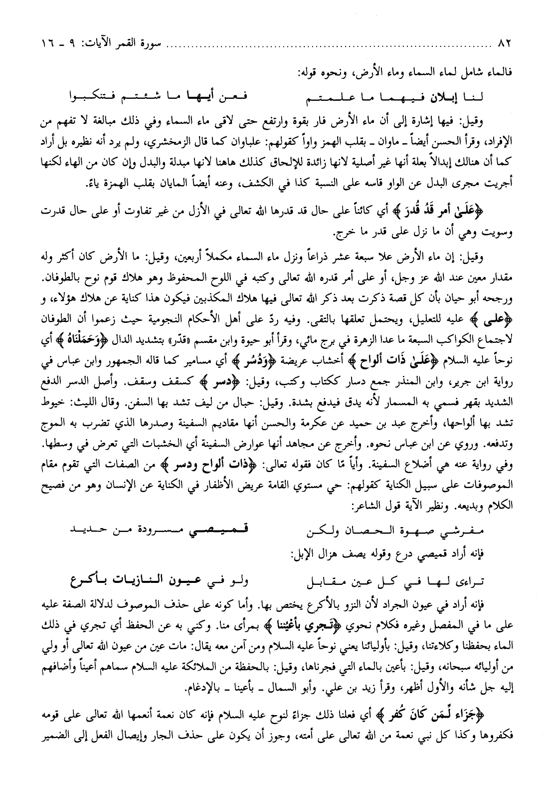 ورجحه أبو حيان بأن كل قصة ذكرت بعد ذكر الله تعالى فيها هلاك المكذبين فيكون هذا كناية عن هلاك هؤلاء، وعَلى عليه للتعليل، ويحتمل تعلقها بالتقى. وفيه ردّ على أهل الأحكام النجومية حيث زعموا أن الطوفان لاجتماع الكواكب السبعة ما عدا الزهرة في برج مائي، وقرأ أبو حيوة وابن مقسم «قدّر» بتشديد الدال وَحَمَلْناهُ أي نوحا عليه السلام عَلى ذاتِ أَلْواحٍ أخشاب عريضة وَدُسُرٍ أي مسامير كما قاله الجمهور وابن عباس في رواية ابن جرير، وابن المنذر جمع دسار ككتاب وكتب، وقيل: دُسُرٍ كسقف وسقف. وأصل الدسر الدفع الشديد بقهر فسمي به المسمار لأنه يدق فيدفع بشدة. وقيل: حبال من ليف تشد بها السفن. وقال الليث: خيوط تشد بها ألواحها، وأخرج عبد بن حميد عن عكرمة والحسن أنها مقاديم السفينة وصدرها الذي تضرب به الموج وتدفعه. وروي عن ابن عباس نحوه. وأخرج عن مجاهد أنها عوارض السفينة أي الخشبات التي تعرض في وسطها.