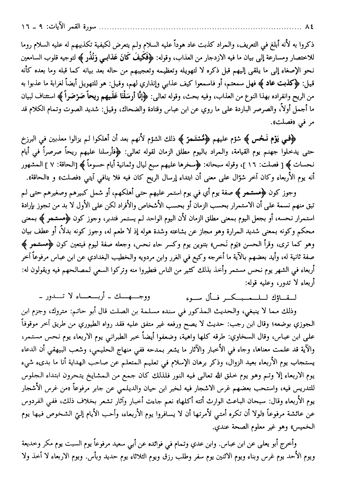 وجوز كون مُسْتَمِرٍّ صفة يوم أي في يوم استمر عليهم حتى أهلكهم، أو شمل كبيرهم وصغيرهم حتى لم تبق منهم نسمة على أن الاستمرار بحسب الزمان أو بحسب الأشخاص والأفراد لكن على الأول لا بد من تجوز بإرادة استمرار نحسه، أو بجعل اليوم بمعنى مطلق الزمان لأن اليوم الواحد لم يستمر فتدبر، وجوز كون مُسْتَمِرٍّ بمعنى محكم وكونه بمعنى شديد المرارة وهو مجاز عن بشاعته وشدة هوله إذ لا طعم له، وجوز كونه بدلا، أو عطف بيان وهو كما ترى، وقرأ الحسن «يوم نحس» بتنوين يوم وكسر حاء نحس، وجعله صفة ليوم فيتعين كون مُسْتَمِرٍّ صفة ثانية له، وأيد بعضهم بالآية ما أخرجه وكيع في الغرر وابن مردويه والخطيب البغدادي عن ابن عباس مرفوعا آخر أربعاء في الشهر يوم نحس مستمر وأخذ بذلك كثير من الناس فتطيروا منه وتركوا السعي لمصالحهم فيه ويقولون له: