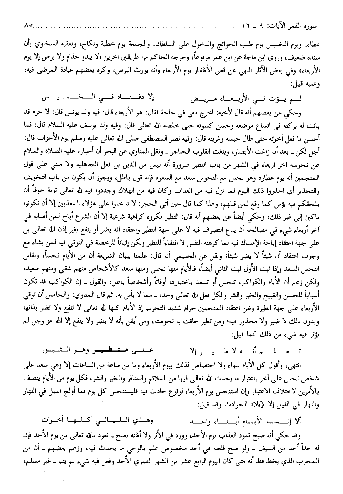 أجل لكن- بعد أن زاغت الأبصار، وبلغت القلوب الحناجر- ونقل المناوي عن البحر أن أخباره عليه الصلاة والسلام عن نحوسه آخر أربعاء في الشهر من باب التطير ضرورة أنه ليس من الدين بل فعل الجاهلية ولا مبني على قول المنجمين أنه يوم عطارد وهو نحس مع النحوس سعد مع السعود فإنه قول باطل، ويجوز أن يكون من باب التخويف والتحذير أي احذروا ذلك اليوم لما نزل فيه من العذاب وكان فيه من الهلاك وجددوا فيه لله تعالى توبة خوفا أن يلحقكم فيه بؤس كما وقع لمن قبلهم، وهذا كما قال حين أتى الحجر: لا تدخلوا على هؤلاء المعذبين إلا أن تكونوا باكين إلى غير ذلك، وحكي أيضا عن بعضهم أنه قال: التطير مكروه كراهية شرعية إلا أن الشرع أباح لمن أصابه في آخر أربعاء شيء في مصالحه أن يدع التصرف فيه لا على جهة التطير واعتقاد أنه يضر أو ينفع بغير إذن الله تعالى بل على جهة اعتقاد إباحة الإمساك فيه لما كرهته النفس لا اقتفاءا للتطير ولكن إثباتا للرخصة في التوقي فيه لمن يشاء مع وجوب اعتقاد أن شيئا لا يضر شيئا ونقل عن الحليمي أنه قال: علمنا ببيان الشريعة أن من الأيام نحسا، ويقابل النحس السعد وإذا ثبت الأول ثبت الثاني أيضا، فالأيام منها نحس ومنها سعد كالأشخاص منهم شقي ومنهم سعيد، ولكن زعم أن الأيام والكواكب تنحس أو تسعد باختيارها أوقاتا وأشخاصا باطل، والقول- إن الكواكب قد تكون أسبابا للحسن والقبيح والخير والشر والكل فعل الله تعالى وحده- مما لا بأس به. ثم قال المناوي: والحاصل أن توقي الأربعاء على جهة الطيرة وظن اعتقاد المنجمين حرام شديد التحريم إذ الأيام كلها لله تعالى لا تنفع ولا تضر بذاتها وبدون ذلك لا ضير ولا محذور فيه ومن تطير حاقت به نحوسته، ومن أيقن بأنه لا يضر ولا ينفع إلا الله عز وجل لم يؤثر فيه شيء من ذلك كما قيل: