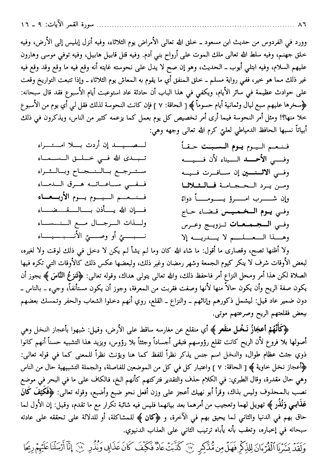 فنعم اليوم يوم السبت حقا لصيد إن أردت بلا امتراء وفي الأحد البناء لأن فيه تبدى الله في خلق السماء وفي الاثنين إن سافرت فيه سترجع بالنجاح وبالثراء ومن يرد الحجامة فالثلاثا ففي ساعاته هرق الدماء وإن شرب امرؤ يوما دواء فنعم اليوم يوم الأربعاء وفي يوم الخميس قضاء حاج فإن الله يأذن بالقضاء وفي الجمعات تزويج وعرس ولذات الرجال مع النساء وهذا العلم لا يدريه إلا نبيّ أو وصيّ الأنبياء