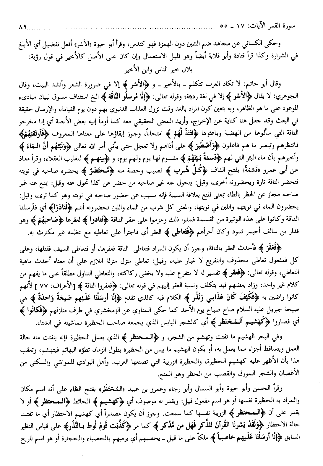 بلال خير الناس وابن الأخير وقال أبو حاتم: لا تكاد العرب تتكلم- بالأخير- والْأَشِرُ إلا في ضرورة الشعر وأنشد البيت، وقال الجوهري: لا يقال الْأَشِرُ إلا في لغة رديئة وقوله تعالى: إِنَّا مُرْسِلُوا النَّاقَةِ إلخ استئناف مسوق لبيان مبادئ الموعود على ما هو الظاهر، وبه يتعين كون المراد بالغد وقت نزول العذاب الدنيوي بهم دون يوم القيامة، والإرسال حقيقة في البعث وقد جعل هنا كناية عن الإخراج، وأريد المعنى الحقيقي معه كما أومأ إليه بعض الأجلة أي إنا مخرجو الناقة التي سألوها من الهضبة وباعثوها فِتْنَةً لَهُمْ امتحانا، وجوز إبقاؤها على معناها المعروف فَارْتَقِبْهُمْ فانتظرهم وتبصر ما هم فاعلون وَاصْطَبِرْ على أذاهم ولا تعجل حتى يأتي أمر الله تعالى وَنَبِّئْهُمْ أَنَّ الْماءَ وأخبرهم بأن ماء البئر التي لهم قِسْمَةٌ بَيْنَهُمْ مقسوم لها يوم ولهم يوم، وبَيْنَهُمْ لتغليب العقلاء، وقرأ معاذ عن أبي عمرو «قسمة» بفتح القاف كُلُّ شِرْبٍ نصيب وحصة منه مُحْتَضَرٌ يحضره صاحبه في نوبته فتحضر الناقة تارة ويحضرونه أخرى، وقيل: يتحول عنه غير صاحبه من حضر عن كذا تحول عنه وقيل: يمنع عنه غير صاحبه مجاز عن الحظر بالظاء بمعنى المنع بعلاقة السببية فإنه مسبب عن حضور صاحبه في نوبته وهو كما ترى، وقيل:
