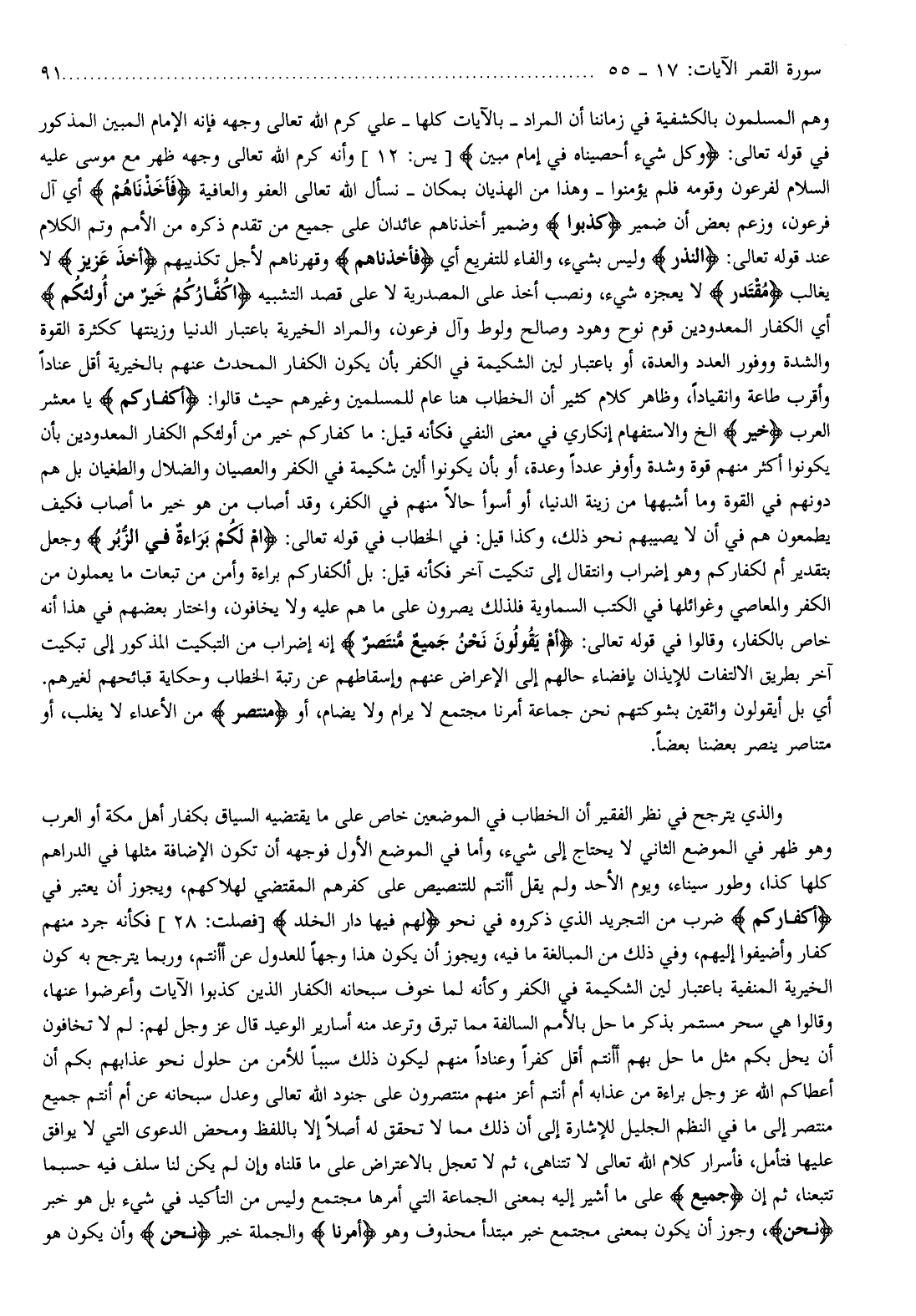 وهم المسلمون بالكشفية في زماننا أن المراد- بالآيات كلها- علي كرم الله تعالى وجهه فإنه الإمام المبين المذكور في قوله تعالى: وَكُلَّ شَيْءٍ أَحْصَيْناهُ فِي إِمامٍ مُبِينٍ [يس: 12] وأنه كرم الله تعالى وجهه ظهر مع موسى عليه السلام لفرعون وقومه فلم يؤمنوا- وهذا من الهذيان بمكان- نسأل الله تعالى العفو والعافية فَأَخَذْناهُمْ أي آل فرعون، وزعم بعض أن ضمير كَذَّبُوا وضمير أخذناهم عائدان على جميع من تقدم ذكره من الأمم وتم الكلام عند قوله تعالى: النُّذُرُ وليس بشيء، والفاء للتفريع أي فَأَخَذْناهُمْ وقهرناهم لأجل تكذيبهم أَخْذَ عَزِيزٍ لا يغالب مُقْتَدِرٍ لا يعجزه شيء، ونصب أخذ على المصدرية لا على قصد التشبيه أَكُفَّارُكُمْ خَيْرٌ مِنْ أُولئِكُمْ أي الكفار المعدودين قوم نوح وهود وصالح ولوط وآل فرعون، والمراد الخيرية باعتبار الدنيا وزينتها ككثرة القوة والشدة ووفور العدد والعدة، أو باعتبار لين الشكيمة في الكفر بأن يكون الكفار المحدث عنهم بالخيرية أقل عنادا وأقرب طاعة وانقيادا، وظاهر كلام كثير أن الخطاب هنا عام للمسلمين وغيرهم حيث قالوا: أَكُفَّارُكُمْ يا معشر العرب خَيْرٌ إلخ والاستفهام إنكاري في معنى النفي فكأنه قيل: ما كفاركم خير من أولئكم الكفار المعدودين بأن يكونوا أكثر منهم قوة وشدة وأوفر عددا وعدة، أو بأن يكونوا ألين شكيمة في الكفر والعصيان والضلال والطغيان بل هم دونهم في القوة وما أشبهها من زينة الدنيا، أو أسوأ حالا منهم في الكفر، وقد أصاب من هو خير ما أصاب فكيف يطمعون هم في أن لا يصيبهم نحو ذلك، وكذا قيل: في الخطاب في قوله تعالى: أَمْ لَكُمْ بَراءَةٌ فِي الزُّبُرِ وجعل بتقدير أم لكفاركم وهو إضراب وانتقال إلى تنكيت آخر فكأنه قيل: بل ألكفار كم براءة وأمن من تبعات ما يعملون من الكفر والمعاصي وغوائلها في الكتب السماوية فلذلك يصرون على ما هم عليه ولا يخافون، واختار بعضهم في هذا أنه خاص بالكفار، وقالوا في قوله تعالى: أَمْ يَقُولُونَ نَحْنُ جَمِيعٌ مُنْتَصِرٌ إنه إضراب من التبكيت المذكور إلى تبكيت آخر بطريق الالتفات للإيذان بإفضاء حالهم إلى الإعراض عنهم وإسقاطهم عن رتبة الخطاب وحكاية قبائحهم لغيرهم.