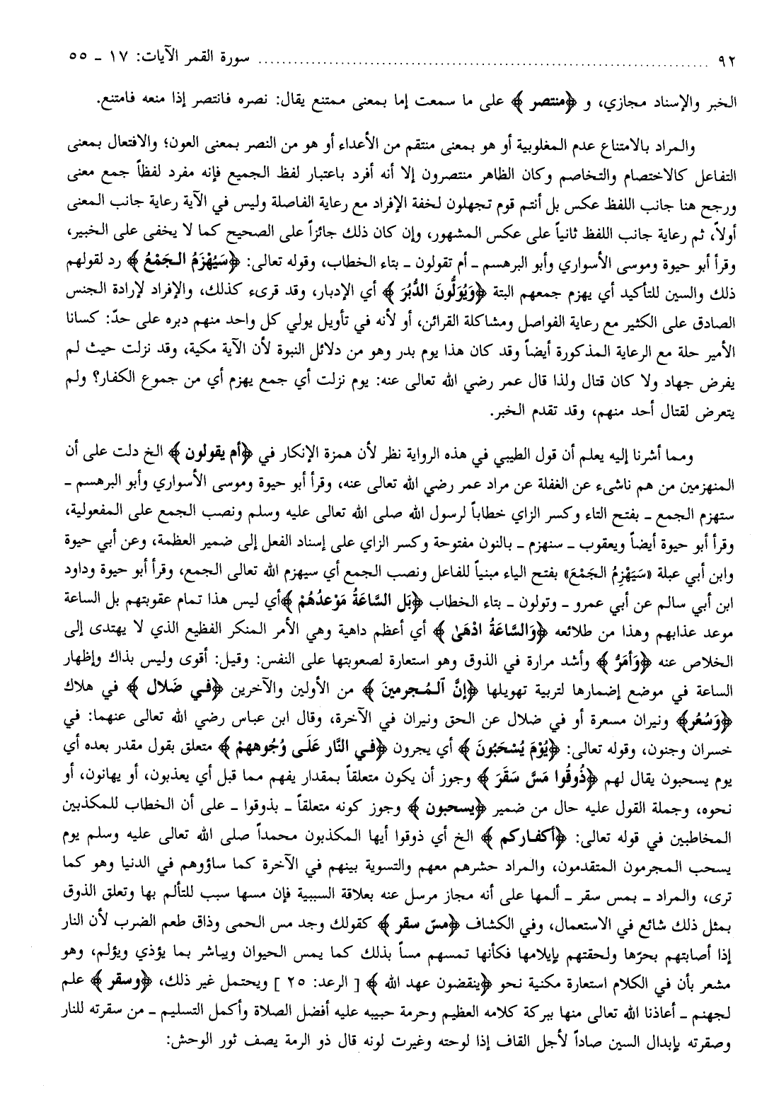 ومما أشرنا إليه يعلم أن قول الطيبي في هذه الرواية نظر لأن همزة الإنكار في أَمْ يَقُولُونَ إلخ دلت على أن المنهزمين من هم ناشىء عن الغفلة عن مراد عمر رضي الله تعالى عنه، وقرأ أبو حيوة وموسى الأسواري وأبو البرهسم- ستهزم الجمع- بفتح التاء وكسر الزاي خطابا لرسول الله صلى الله تعالى عليه وسلم ونصب الجمع على المفعولية، وقرأ أبو حيوة أيضا ويعقوب- سنهزم- بالنون مفتوحة وكسر الزاي على إسناد الفعل إلى ضمير العظمة، وعن أبي حيوة وابن أبي عبلة «سيهزم الجمع» بفتح الياء مبنيا للفاعل ونصب الجمع أي سيهزم الله تعالى الجمع، وقرأ أبو حيوة وداود ابن أبي سالم عن أبي عمرو- وتولون- بتاء الخطاب بَلِ السَّاعَةُ مَوْعِدُهُمْ أي ليس هذا تمام عقوبتهم بل الساعة موعد عذابهم وهذا من طلائعه وَالسَّاعَةُ أَدْهى أي أعظم داهية وهي الأمر المنكر الفظيع الذي لا يهتدى إلى الخلاص عنه وَأَمَرُّ وأشد مرارة في الذوق وهو استعارة لصعوبتها على النفس: وقيل: أقوى وليس بذاك وإظهار الساعة في موضع إضمارها لتربية تهويلها إِنَّ الْمُجْرِمِينَ من الأولين والآخرين فِي ضَلالٍ في هلاك وَسُعُرٍ ونيران مسعرة أو في ضلال عن الحق ونيران في الآخرة، وقال ابن عباس رضي الله تعالى عنهما: في خسران وجنون، وقوله تعالى: يَوْمَ يُسْحَبُونَ أي يجرون فِي النَّارِ عَلى وُجُوهِهِمْ متعلق بقول مقدر بعده أي يوم يسحبون يقال لهم ذُوقُوا مَسَّ سَقَرَ وجوز أن يكون متعلقا بمقدار يفهم مما قبل أي يعذبون، أو يهانون، أو نحوه، وجملة القول عليه حال من ضمير يُسْحَبُونَ وجوز كونه متعلقا- بذوقوا- على أن الخطاب للمكذبين المخاطبين في قوله تعالى: أَكُفَّارُكُمْ إلخ أي ذوقوا أيها المكذبون محمدا صلى الله تعالى عليه وسلم يوم يسحب المجرمون المتقدمون، والمراد حشرهم معهم والتسوية بينهم في الآخرة كما ساؤوهم في الدنيا وهو كما ترى، والمراد- بمس سقر- ألمها على أنه مجاز مرسل عنه بعلاقة السببية فإن مسها سبب للتألم بها وتعلق الذوق بمثل ذلك شائع في الاستعمال، وفي الكشاف مَسَّ سَقَرَ كقولك وجد مس الحمى وذاق طعم الضرب لأن النار إذا أصابتهم بحرّها ولحقتهم بإيلامها فكأنها تمسهم مسا بذلك كما يمس الحيوان ويباشر بما يؤذي ويؤلم، وهو مشعر بأن في الكلام استعارة مكنية نحو يَنْقُضُونَ عَهْدَ اللَّهِ [الرعد: 25] ويحتمل غير ذلك، وسَقَرَ علم لجهنم- أعاذنا الله تعالى منها ببركة كلامه العظيم وحرمة حبيبه عليه أفضل الصلاة وأكمل التسليم- من سقرته للنار وصقرته بإبدال السين صادا لأجل القاف إذا لوحته وغيرت لونه قال ذو الرمة يصف ثور الوحش:
