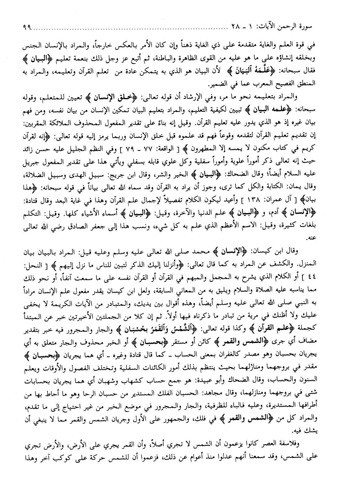 44] أو الكلام الذي يشرح به المجمل والمبهم في القرآن أو القرآن نفسه على ما سمعت آنفا، أو نحو ذلك مما يناسبه عليه الصلاة والسلام ويليق به من المعاني السابقة، ولعل ابن كيسان يقدر مفعول علم الإنسان مرادا به النبي صلى الله تعالى عليه وسلم أيضا، وهذه أقوال بين يديك، والمتبادر من الآيات الكريمة لا يخفى عليك ولا أظنك في مرية من تبادر ما ذكرناه فيها أولا. ثم إن كلا من الجملتين الأخيرتين خبر عن المبتدأ كجملة عَلَّمَ الْقُرْآنَ وكذا قوله تعالى: الشَّمْسُ وَالْقَمَرُ بِحُسْبانٍ والجار والمجرور فيه خبر بتقدير مضاف أي جرى الشَّمْسُ وَالْقَمَرُ كائن أو مستقر بِحُسْبانٍ أو الخبر محذوف والجار متعلق به أي يجريان بحسبان وهو مصدر كالغفران بمعنى الحساب- كما قال قتادة وغيره- أي هما يجريان بِحُسْبانٍ مقدر في بروجهما ومنازلهما بحيث ينتظم بذلك أمور الكائنات السفلية وتختلف الفصول والأوقات ويعلم السنون والحساب، وقال الضحاك وأبو عبيدة: هو جمع حساب كشهاب وشهبان أي هما يجريان بحسابات شتى في بروجهما ومنازلهما، وقال مجاهد: الحسبان الفلك المستدير من حسبان الرحا وهو ما أحاط بها من أطرافها المستديرة، وعليه فالباء للظرفية، والجار والمجرور في موضع الخبر من غير احتياج إلى ما تقدم، والمراد كل من الشَّمْسُ وَالْقَمَرُ في فلك، والجمهور على الأول وجريان الشمس والقمر مما لا ينبغي أن يشك فيه.