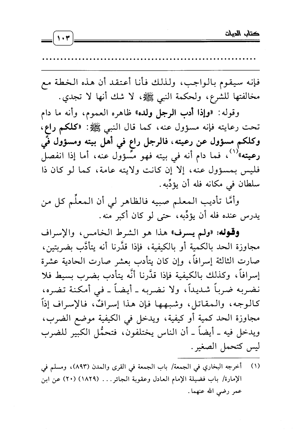 وقوله: «ولم يسرف» هذا هو الشرط الخامس، والإسراف مجاوزة الحد بالكمية أو بالكيفية، فإذا قدَّرنا أنه يتأدَّب بضربتين، صارت الثالثة إسرافاً، وإن كان يتأدب بعشر صارت الحادية عشرة إسرافاً، وكذلك بالكيفية فإذا قدَّرنا أنَّه يتأدب بضرب بسيط فلا نضربه ضرباً شديداً، ولا نضربه ـ أيضاً ـ في أمكنة تضره، كالوجه، والمقاتل، وشبهها فإن هذا إسرافٌ، فالإسراف إذاً مجاوزة الحد كمية أو كيفية، ويدخل في الكيفية موضع الضرب، ويدخل فيه ـ أيضاً ـ أن الناس يختلفون، فتحمُّل الكبير للضرب ليس كتحمل الصغير.