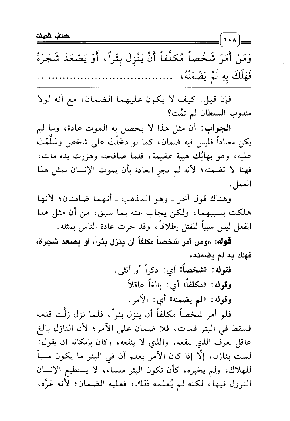 وَمَنْ أَمَرَ شَخْصاً مُكلَّفاً أَنْ يَنْزِلَ بِئْراً، أَوْ يَصْعَدَ شَجَرَةً فَهَلَكَ بِهِ لَمْ يَضْمَنْهُ، ......