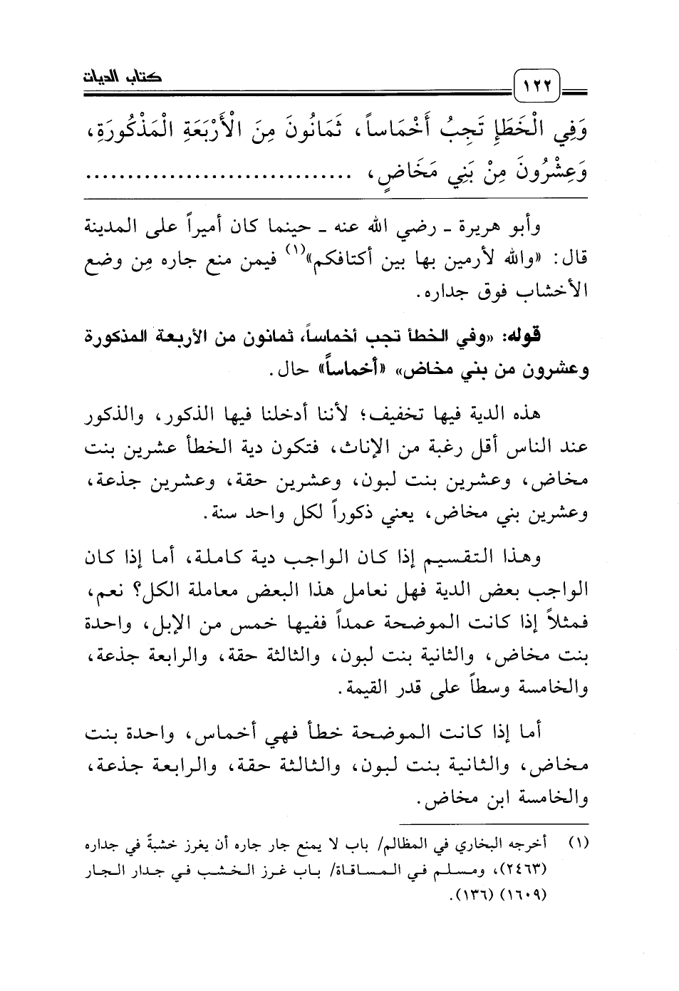 قوله: «وفي الخطأ تجب أخماساً، ثمانون من الأربعة المذكورة وعشرون من بني مخاض» «أخماساً» حال.