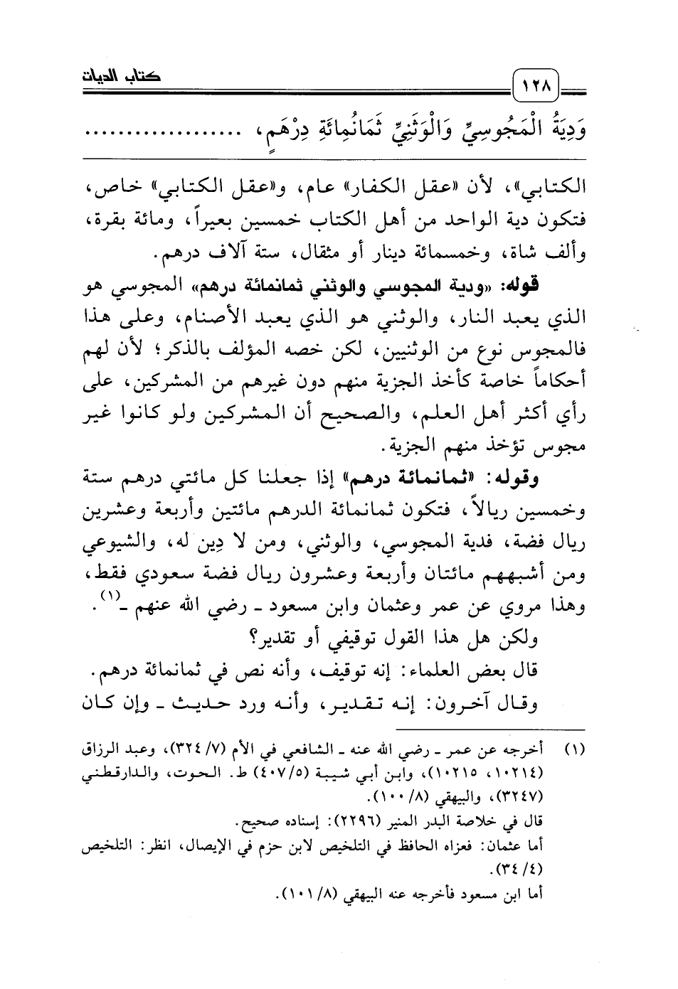 وقوله: «ثمانمائة درهم» إذا جعلنا كل مائتي درهم ستة وخمسين ريالاً، فتكون ثمانمائة الدرهم مائتين وأربعة وعشرين ريال فضة، فدية المجوسي، والوثني، ومن لا دِين له، والشيوعي ومن أشبههم مائتان وأربعة وعشرون ريال فضة سعودي فقط، وهذا مروي عن عمر وعثمان وابن مسعود ـ رضي الله عنهم ـ (¬1).