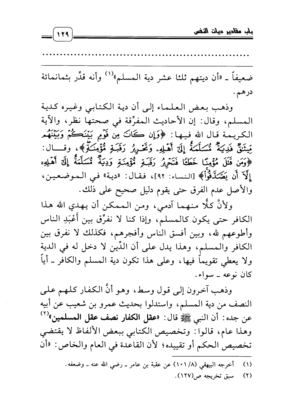 وذهب آخرون إلى قول وسط، وهو أنَّ الكفار كلهم على النصف من دية المسلم، واستدلوا بحديث عمرو بن شعيب عن أبيه عن جده: أن النبي صلّى الله عليه وسلّم قال: «عقل الكفار نصف عقل المسلمين» (¬2) وهذا عام، قالوا: وتخصيص الكتابي ببعض الألفاظ لا يقتضي تخصيص الحكم أو تقييده؛ لأن القاعدة في العام والخاص: «أن