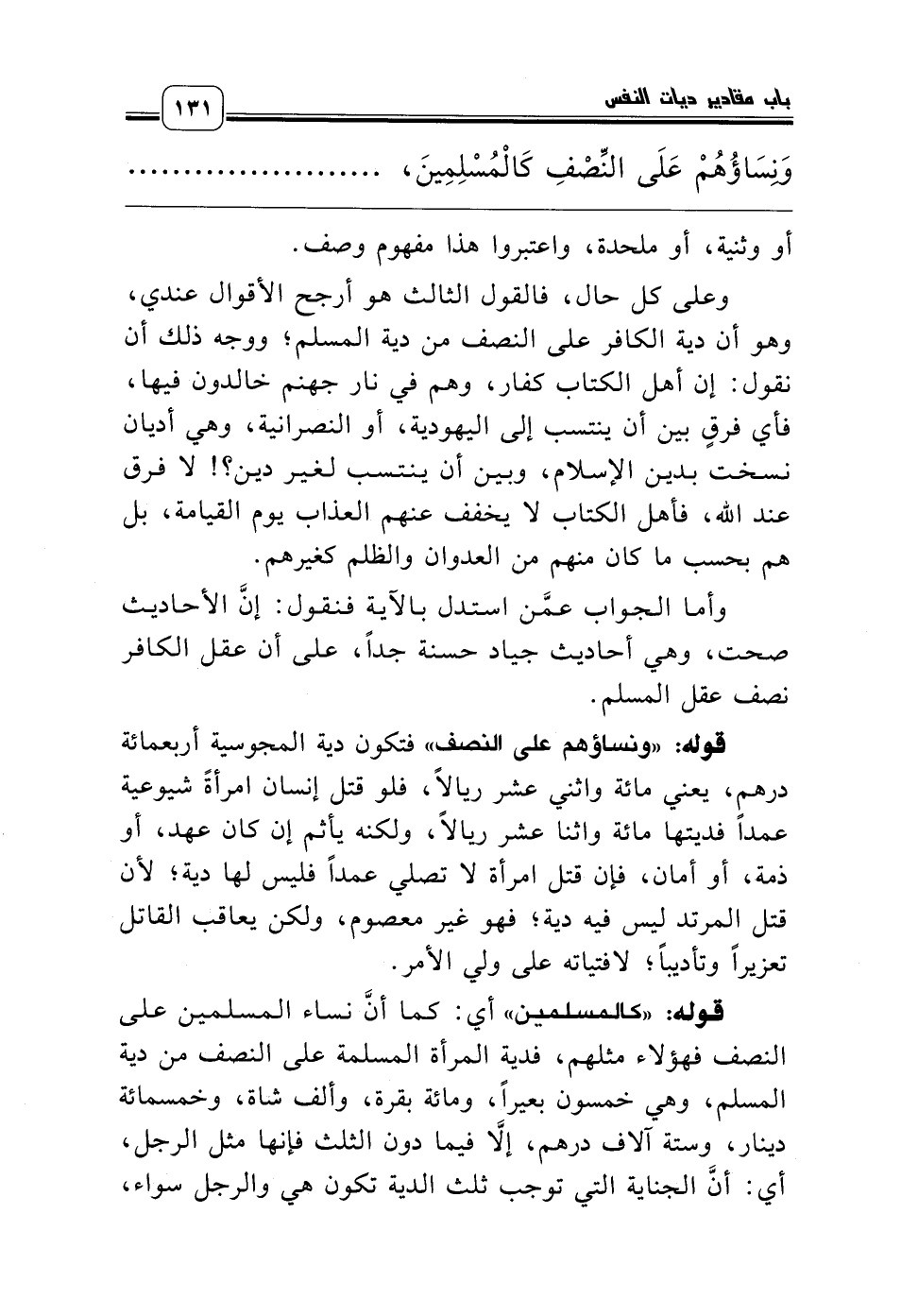 وعلى كل حال، فالقول الثالث هو أرجح الأقوال عندي، وهو أن دية الكافر على النصف من دية المسلم؛ ووجه ذلك أن نقول: إن أهل الكتاب كفار، وهم في نار جهنم خالدون فيها، فأي فرقٍ بين أن ينتسب إلى اليهودية، أو النصرانية، وهي أديان نسخت بدين الإسلام، وبين أن ينتسب لغير دين؟! لا فرق عند الله، فأهل الكتاب لا يخفف عنهم العذاب يوم القيامة، بل هم بحسب ما كان منهم من العدوان والظلم كغيرهم.
