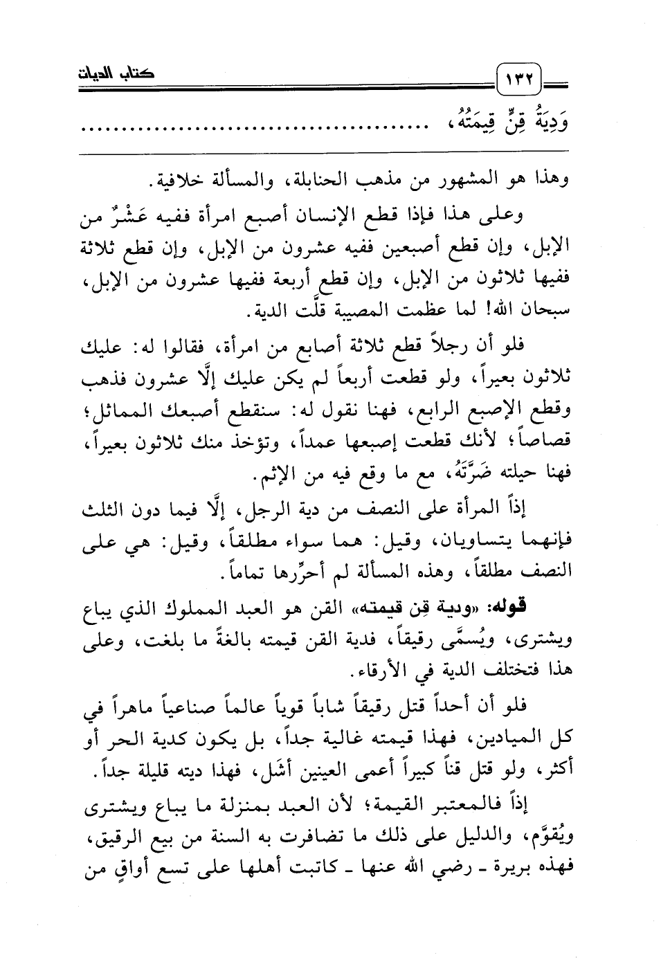قوله: «ودية قِن قيمته» القن هو العبد المملوك الذي يباع ويشترى، ويُسمَّى رقيقاً، فدية القن قيمته بالغةً ما بلغت، وعلى هذا فتختلف الدية في الأرقاء.