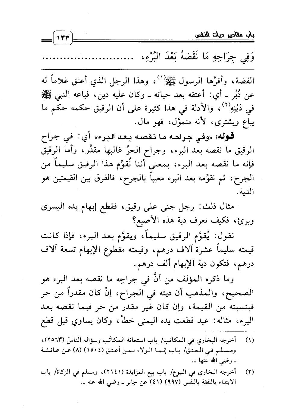 قوله: «وفي جراحه ما نقصه بعد البرء» أي: في جراح الرقيق ما نقصه بعد البرء، وجراح الحرِّ غالبها مقدَّر، وأما الرقيق فإنه ما نقصه بعد البرء، بمعنى أننا نُقوِّم هذا الرقيق سليماً من الجرح، ثم نقوِّمه بعد البرء معيباً بالجرح، فالفرق بين القيمتين هو الدية.