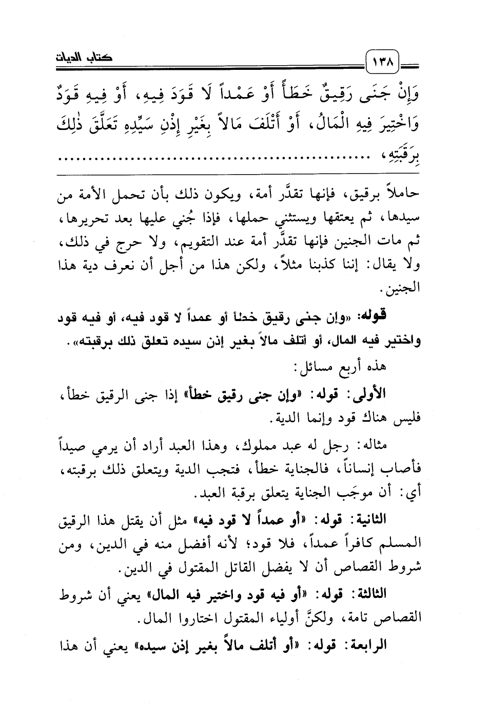 الثانية: قوله: «أو عمداً لا قود فيه» مثل أن يقتل هذا الرقيق المسلم كافراً عمداً، فلا قود؛ لأنه أفضل منه في الدين، ومن شروط القصاص أن لا يفضل القاتل المقتول في الدين.