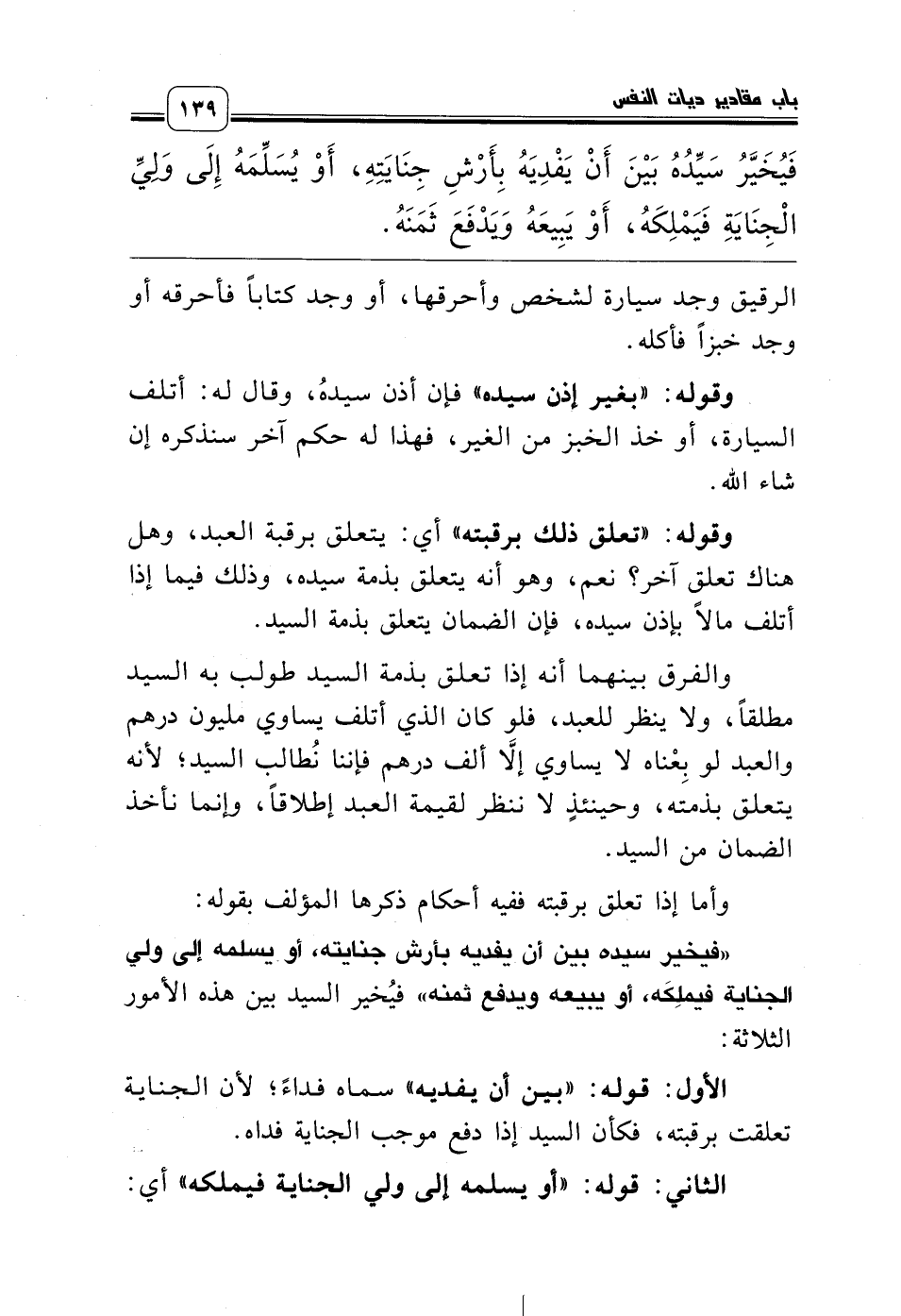 «فيخير سيده بين أن يفديه بأرش جنايته، أو يسلمه إلى ولي الجناية فيملِكَه، أو يبيعه ويدفع ثمنه» فيُخير السيد بين هذه الأمور الثلاثة: