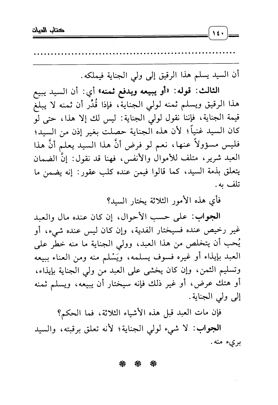 الثالث: قوله: «أو يبيعه ويدفع ثمنه» أي: أن السيد يبيع هذا الرقيق ويسلم ثمنه لولي الجناية، فإذا قُدِّر أن ثمنه لا يبلغ قيمة الجناية، فإننا نقول لولي الجناية: ليس لك إلا هذا، حتى لو كان السيد غنياً؛ لأن هذه الجناية حصلت بغير إذن من السيد؛ فليس مسؤولاً عنها، نعم لو فرض أنَّ هذا السيد يعلم أنَّ هذا العبد شرير، متلف للأموال والأنفس، فهنا قد نقول: إنَّ الضمان يتعلق بذمة السيد، كما قالوا فيمن عنده كلب عقور: إنه يضمن ما تلف به.