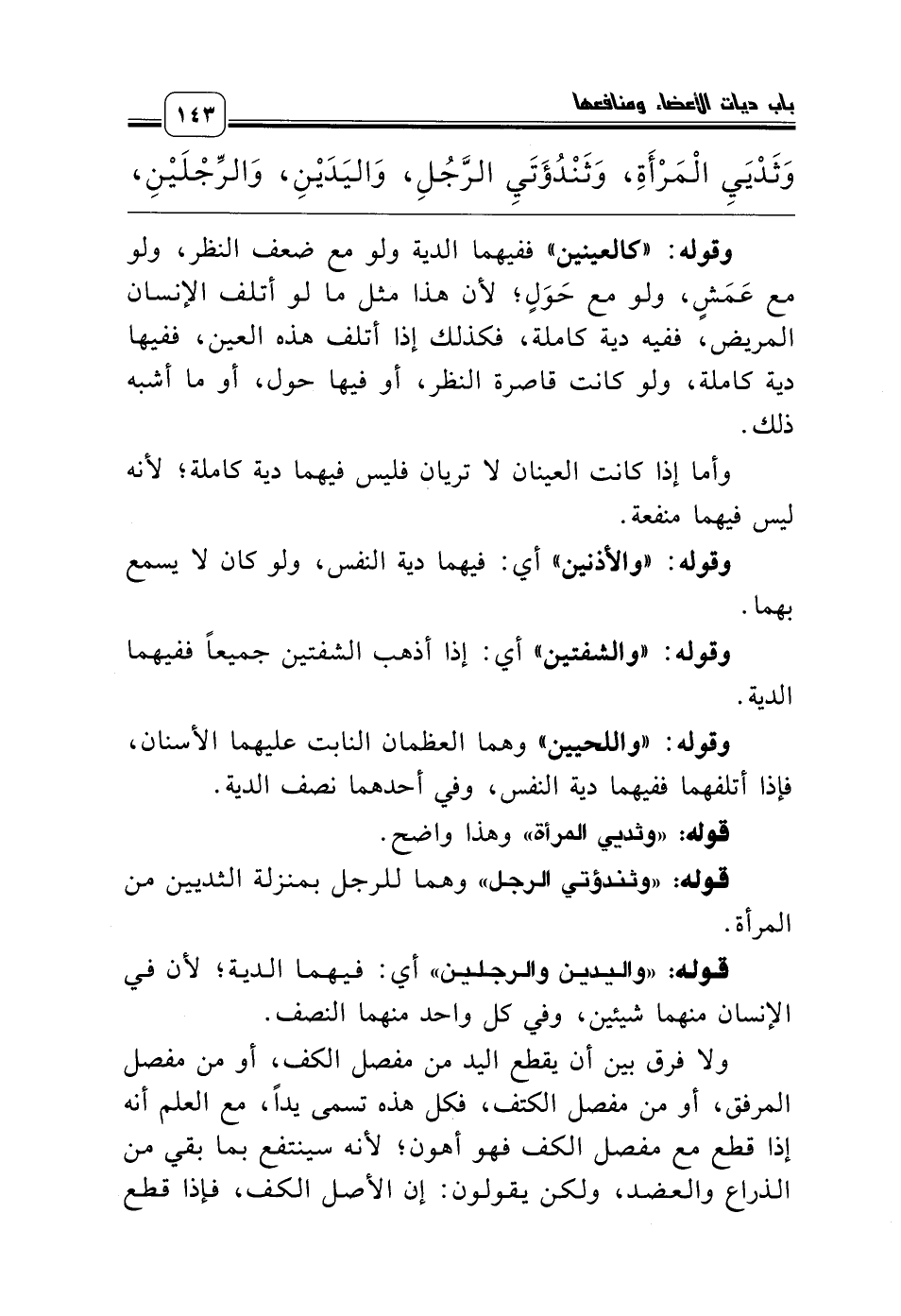 قوله: «واليدين والرجلين» أي: فيهما الدية؛ لأن في الإنسان منهما شيئين، وفي كل واحد منهما النصف.