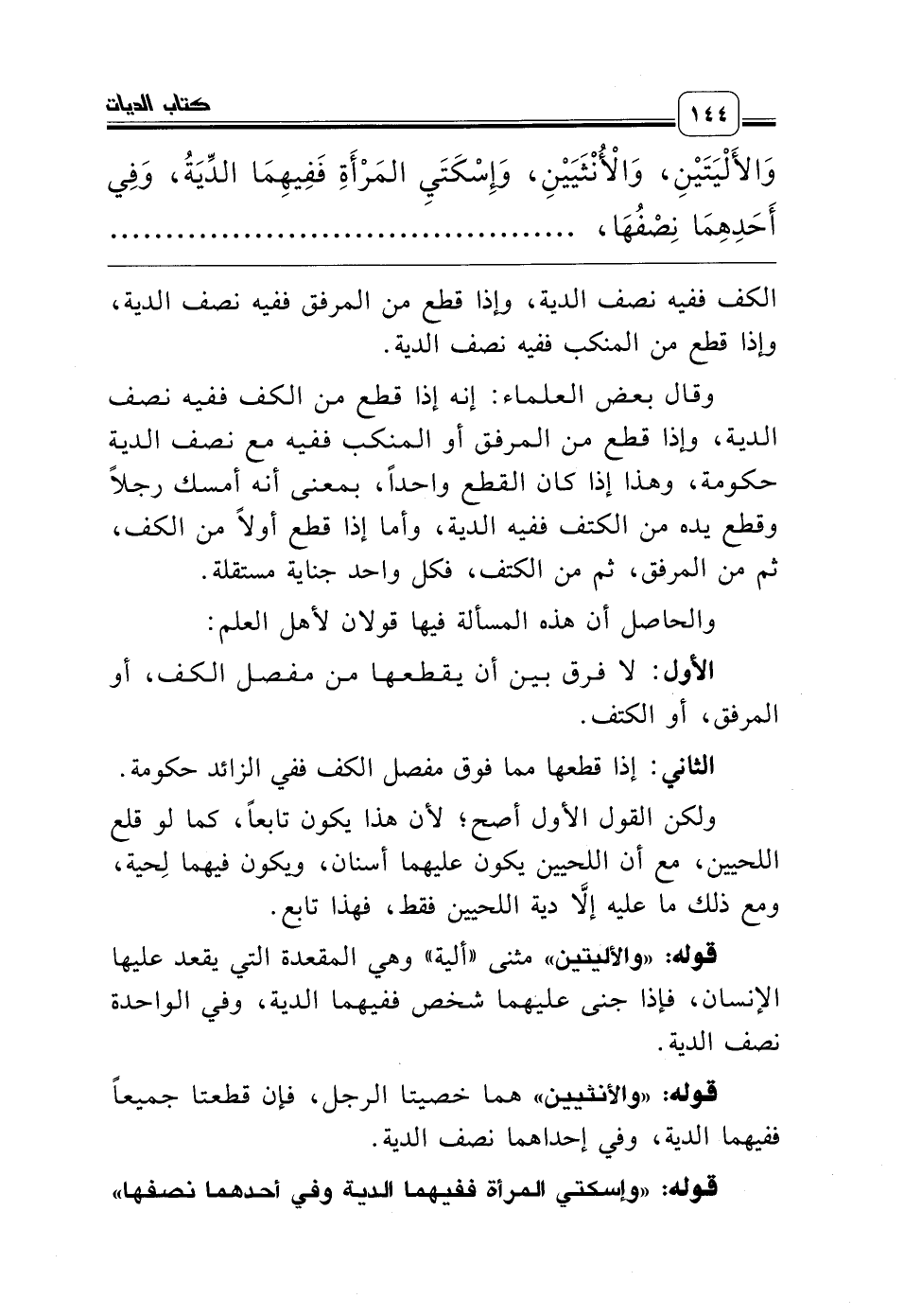 قوله: «والأليتين» مثنى «ألية» وهي المقعدة التي يقعد عليها الإنسان، فإذا جنى عليهما شخص ففيهما الدية، وفي الواحدة نصف الدية.