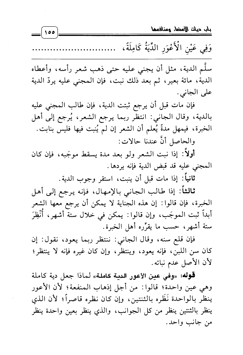 قوله: «وفي عين الأعور الدية كاملة» لماذا جعل دية كاملة وهي عين واحدة؛ قالوا: من أجل إذهاب المنفعة؛ لأن الأعور ينظر بالواحدة نَظَره بالثنتين، وإن كان نظره قاصراً؛ لأن الذي ينظر بالثنتين ينظر من كل الجوانب، والذي ينظر بعين واحدة ينظر من جانب واحد.