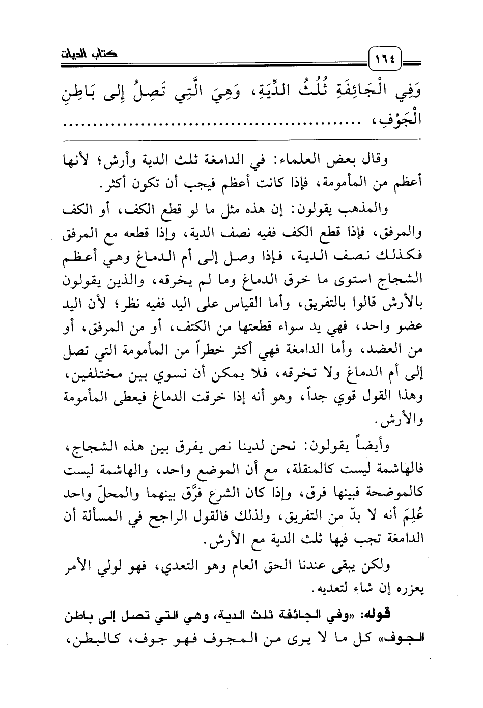 وأيضاً يقولون: نحن لدينا نص يفرق بين هذه الشجاج، فالهاشمة ليست كالمنقلة، مع أن الموضع واحد، والهاشمة ليست كالموضحة فبينها فرق، وإذا كان الشرع فرَّق بينهما والمحلّ واحد عُلِمَ أنه لا بدّ من التفريق، ولذلك فالقول الراجح في المسألة أن الدامغة تجب فيها ثلث الدية مع الأرش.